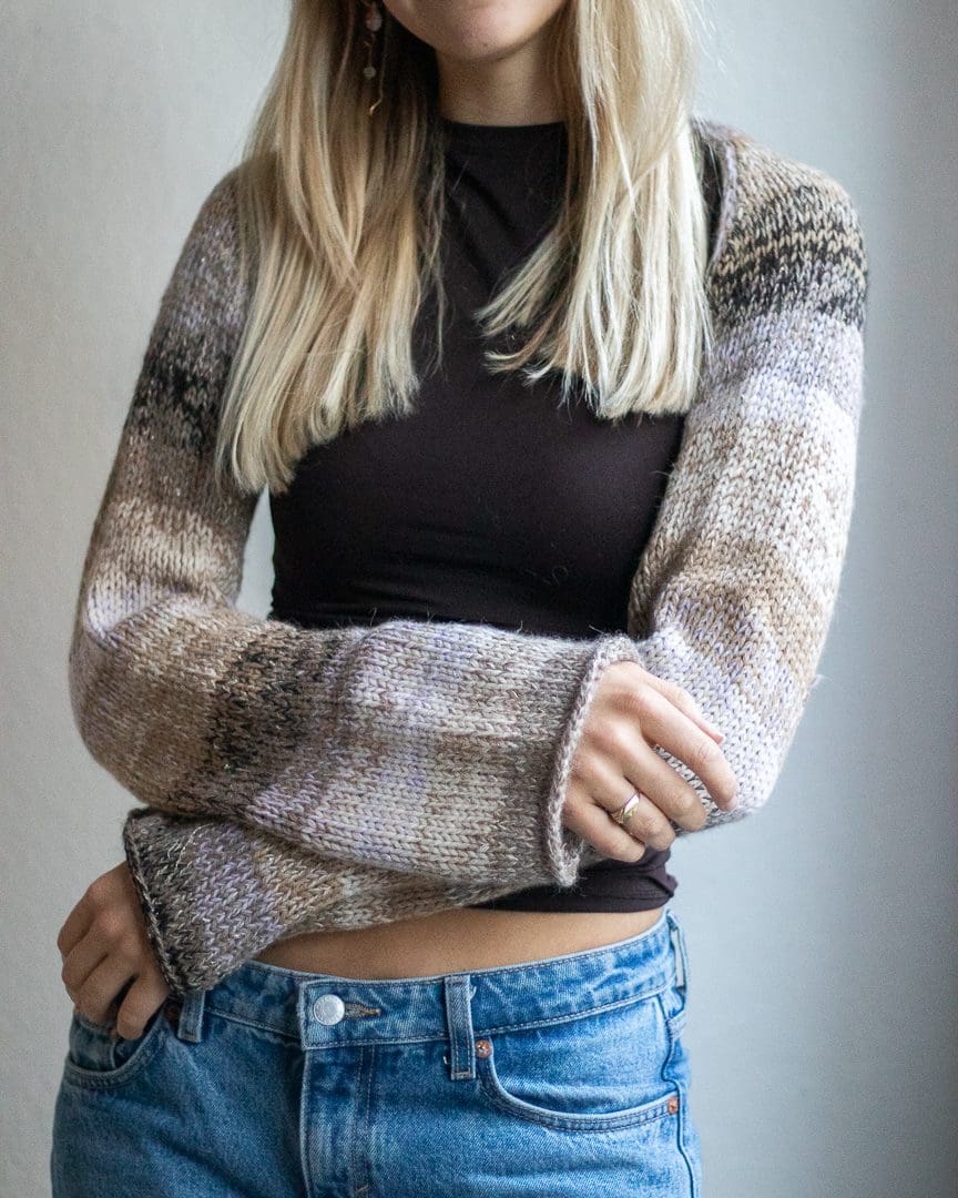 Heather Bolero is knitted in Tante Grøns Bouclé, which gives the bolero a light and lively expression, even though it is exclusively knitted in stockinette stitch. The bolero is also suitable as a leftover yarn project, which gives plenty of opportunity to use the leftovers and give the bolero a nice colour play.