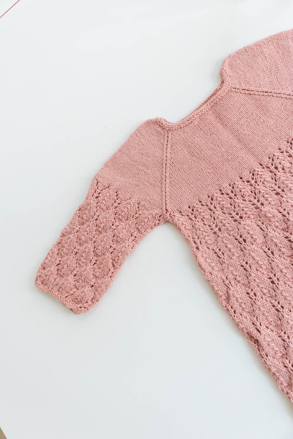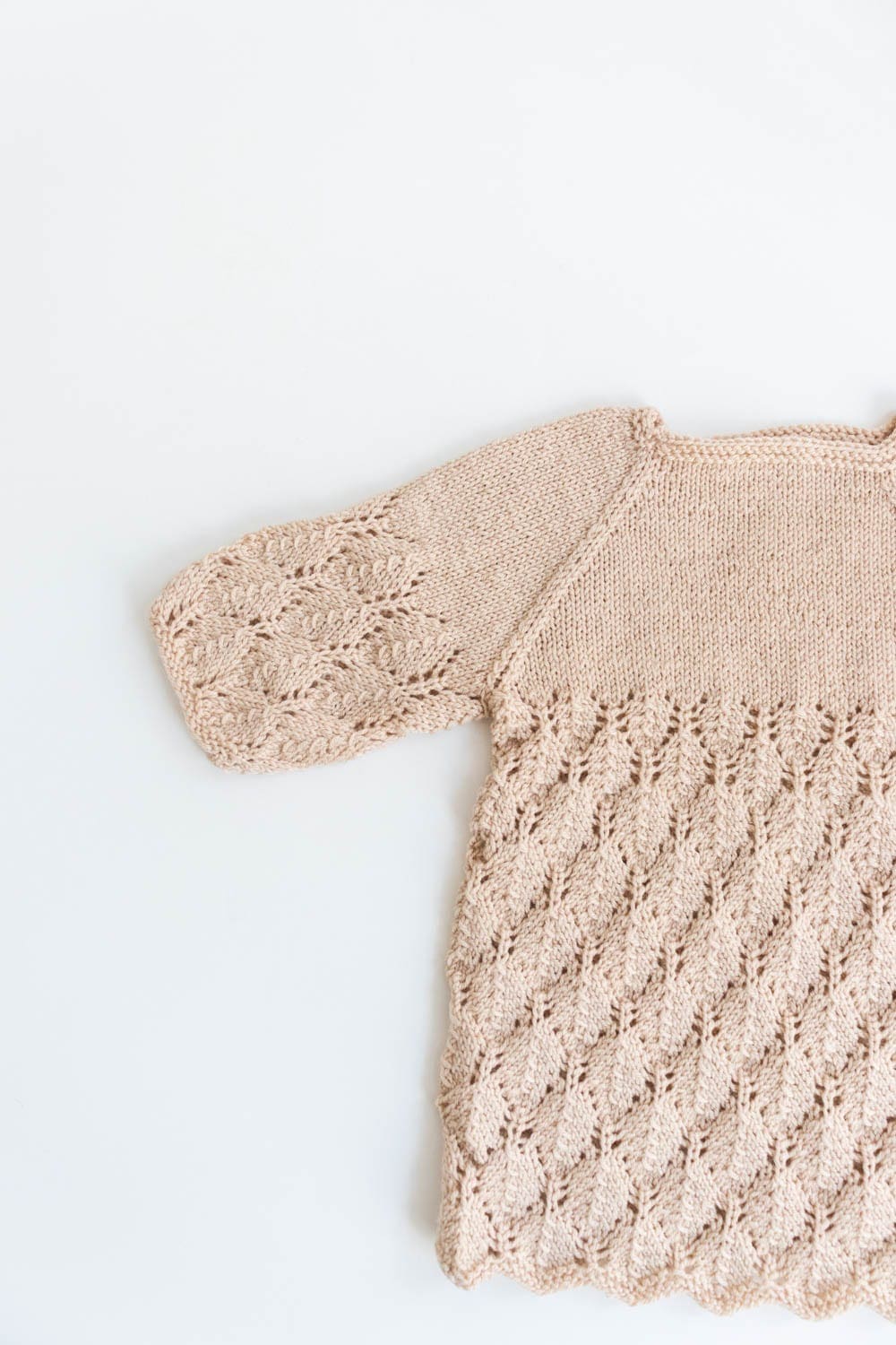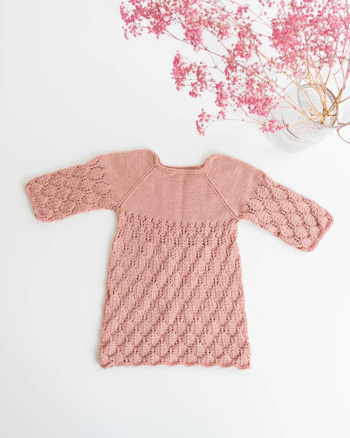Den fineste kjole med hulmønster. Opskriften går fra størrelse 6 mdr. til 5-6 år. Kjolen er så fin over et par strømpebukser sammen med et par fine sandaler. Kjolen er strikket i Bøllefrø som er en lækker blød merinould.