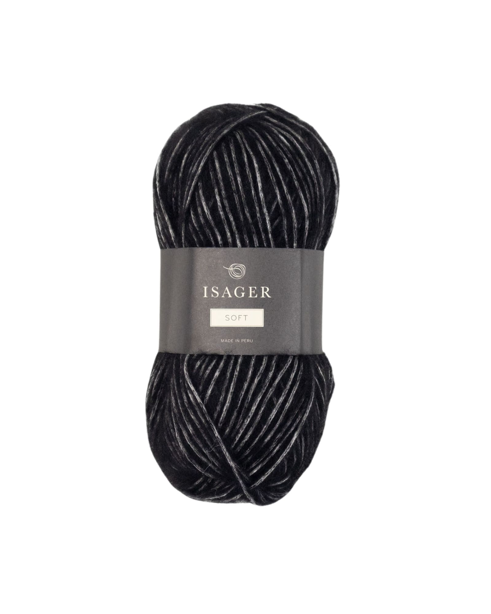 Isager Soft består af 56% Alpaca og 44% Organic Pima Cotton. Den har en løbelængde på 125 m på 50 g, og strikkes på pind 5,5 – 6. Umiddelbart egner den sig til sweatre på samme pindenumre, som vi før har strikket med Silk Mohair og en følgetråd.