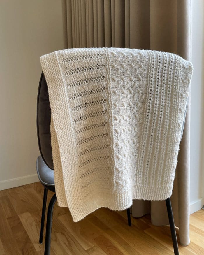 Pak den lille nye ind i kærlighed og varme med Ivory Babytæppe. Tæppet har flere slags mønster og skønne detaljer, som gør babytæppet sjovt at strikke gennem hele arbejdet. Det gør også at det er fint både på ret – og vrangsiden.