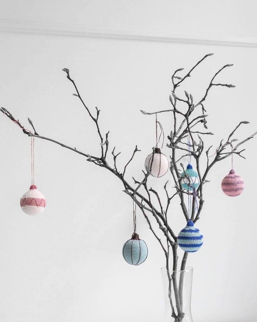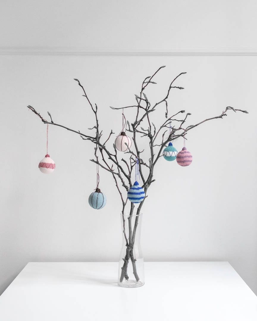 Pynt fint op til jul med disse fine hæklede julekugler. Du vælger mellem tre forskellige styles. Leg med farverne og julekuglerne får et nyt udtryk. Her er julekuglerne hængt på en fin magnolia gren, hvor de pynter så flot på spisebordet.
