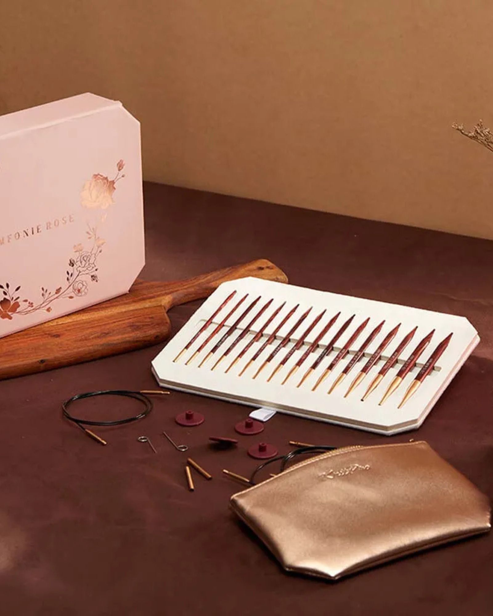 KnitPro Symfonie Rose udskifteligt rundpindesæt deluxe er et smukt og gennemført sæt med pinde i rødbrunt poleret træ. De lette pinde ligger behageligt i hånden, så du kan strikke i timevis uden at blive træt.
