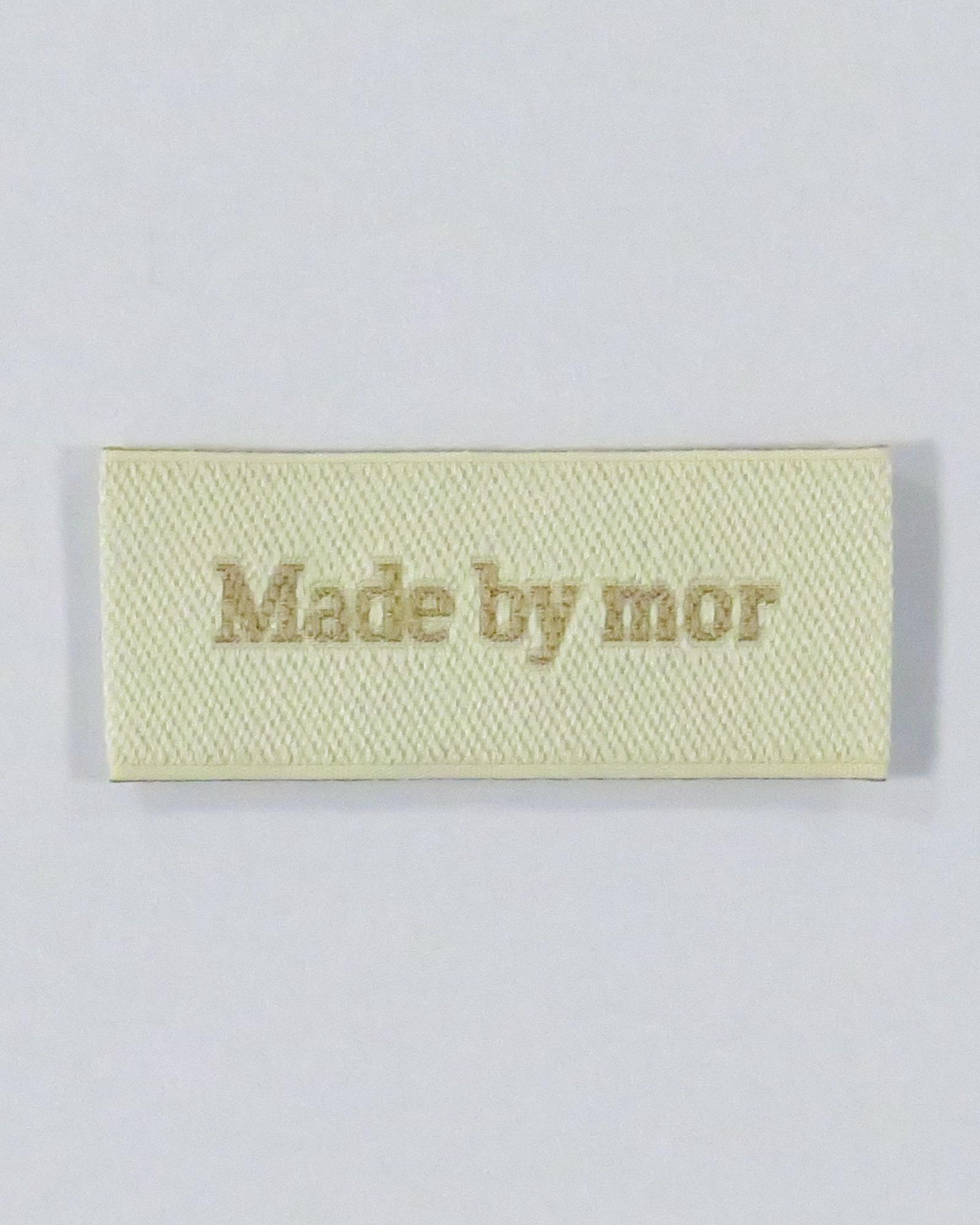 Stof label med testen “Made By Mor” til at sy på strikkede- eller hæklede projekter. Det kan fx syes i nakken af en sweater eller syes på bagsiden af et tæppe.