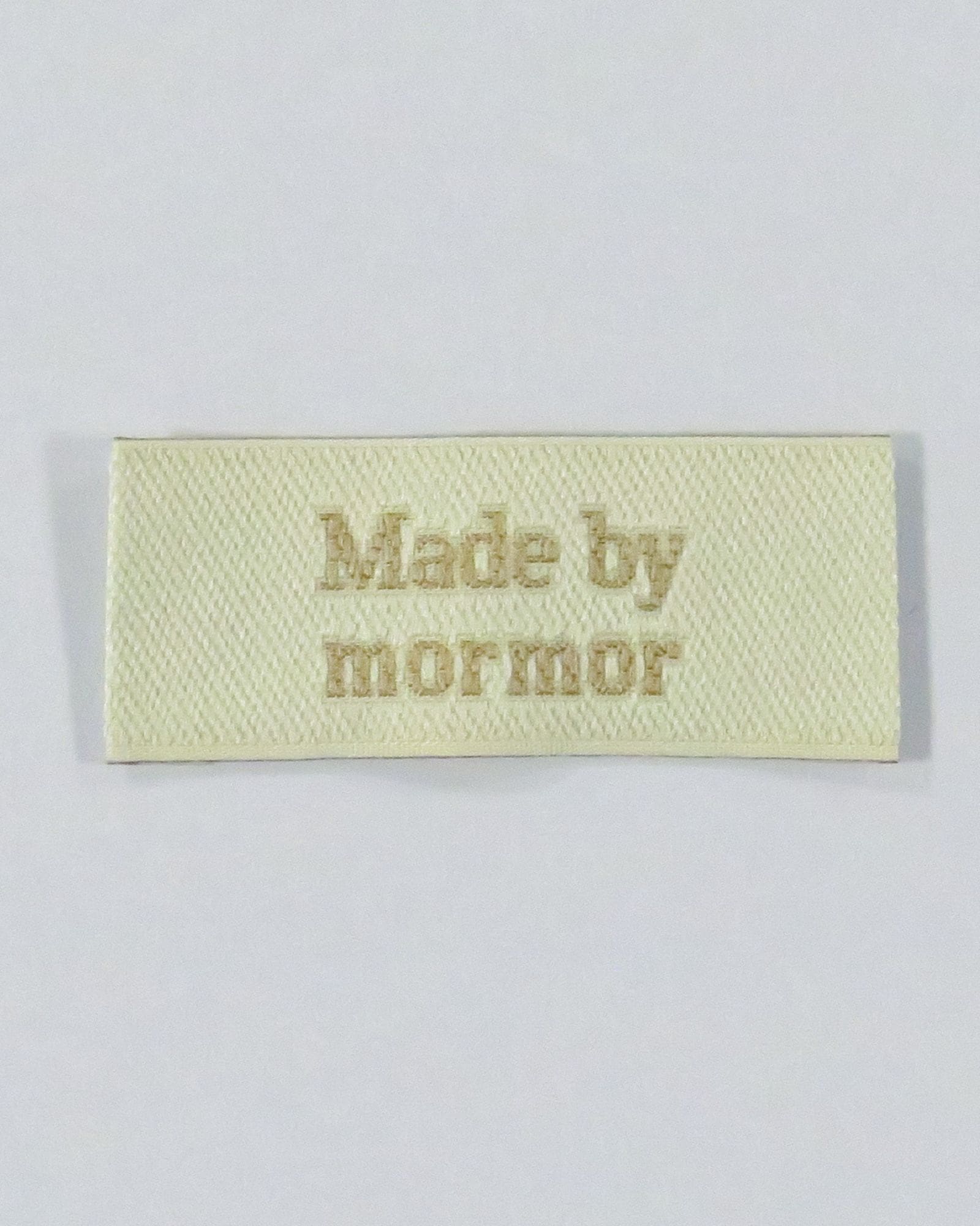 Stof label med testen “Made By Mormor” til at sy på strikkede- eller hæklede projekter. Det kan fx syes i nakken af en sweater eller syes på bagsiden af et tæppe.