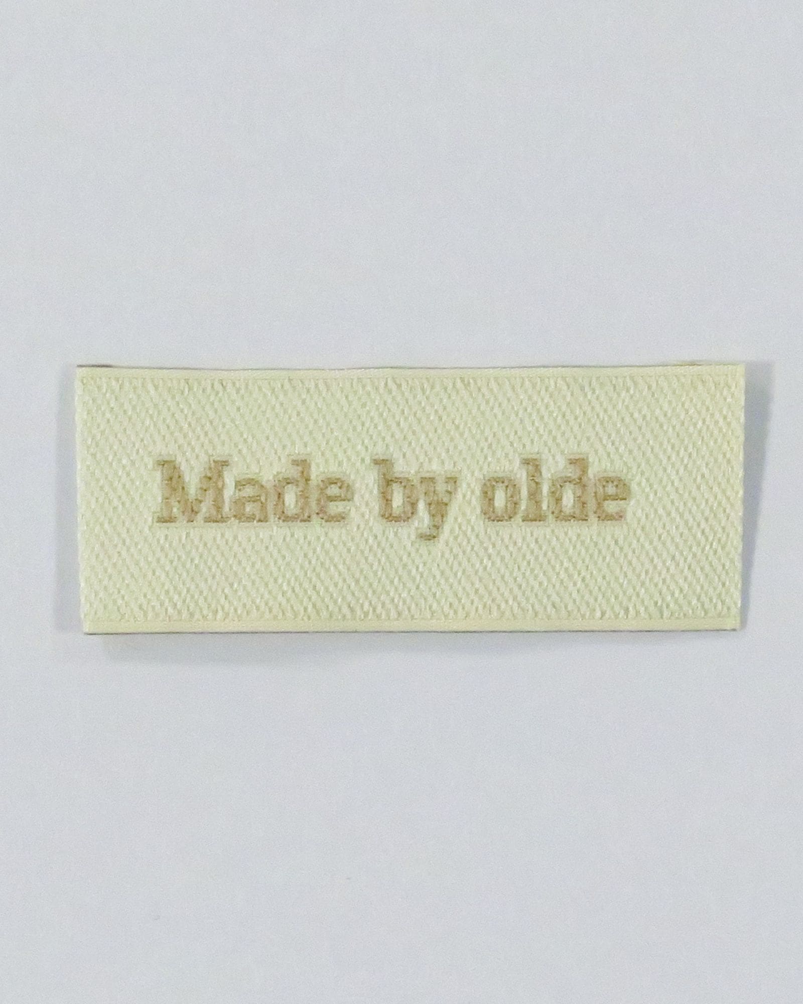 Stof label med testen “Made By Olde” til at sy på strikkede- eller hæklede projekter. Det kan fx syes i nakken af en sweater eller syes på bagsiden af et tæppe.