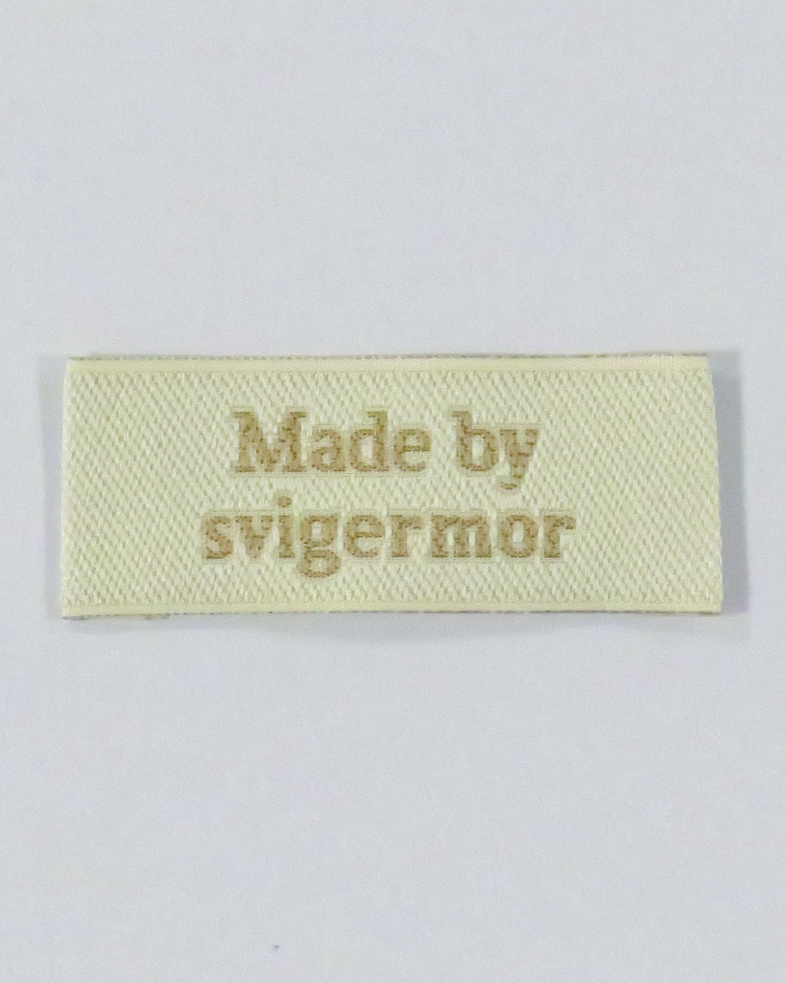 Stof label med testen “Made By Svigermor” til at sy på strikkede- eller hæklede projekter. Det kan fx syes i nakken af en sweater eller syes på bagsiden af et tæppe.