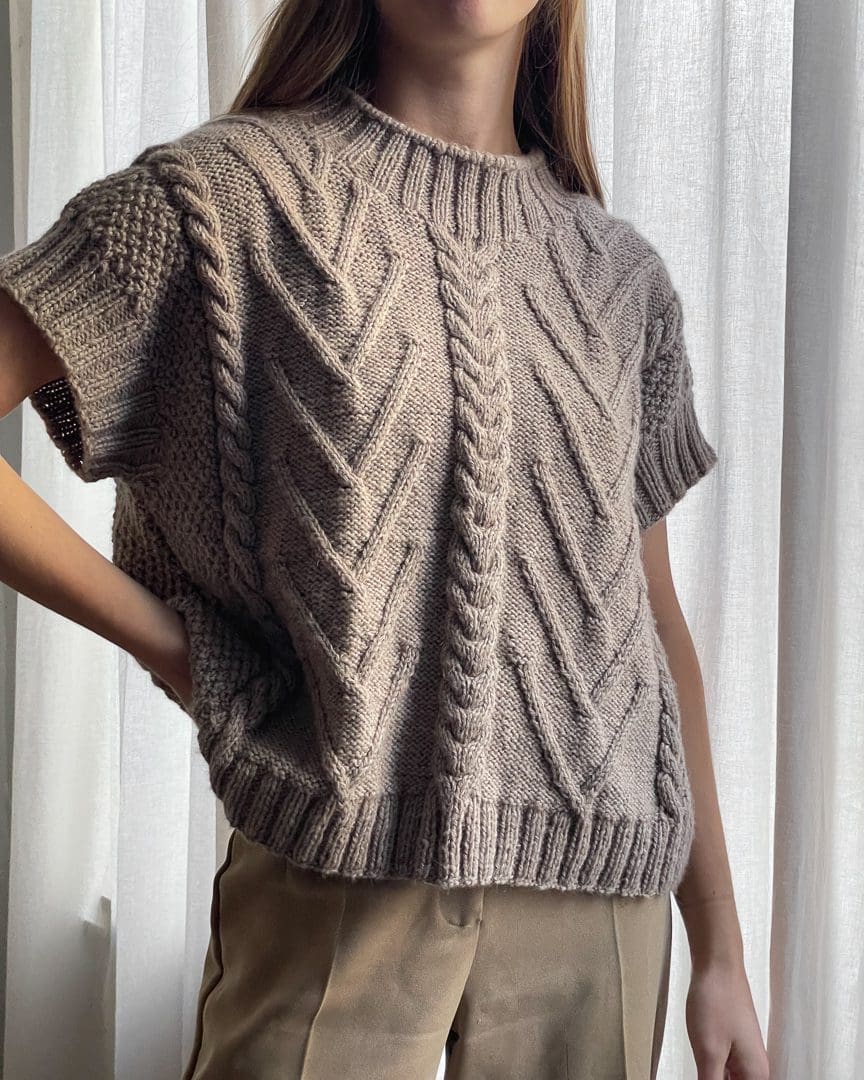 Den beige version af Lane Vest er strikket i Valmue fv. 517 Lys Camel og North fv. 6 Brown Sugar