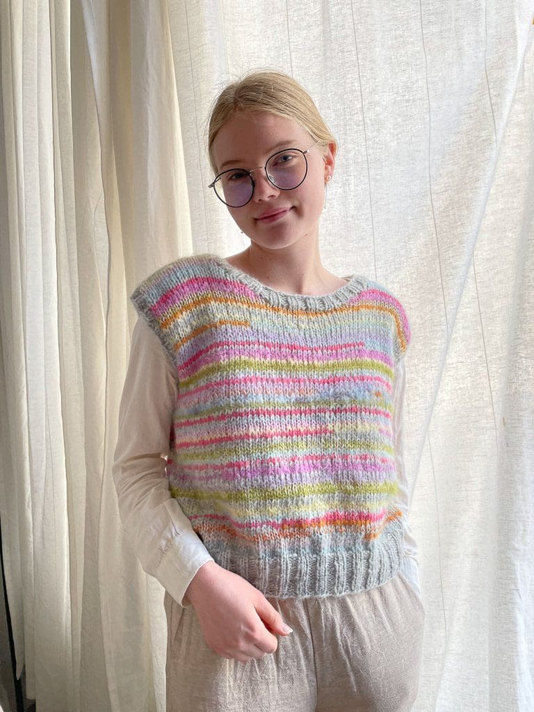 Vi har brugt Snefnug som base i vesten og til kanterne, og så selvfølgelig en masse fine rester i forskellige kvaliteter og tykkelser af ca. 10-20 cm af gangen. Vesten strikkes nedefra og op og er ganske nem at gå til. Først strikkes ribkanten rundt nederst, hvorefter kroppen strikkes. Herefter strikkes ryg – og forstykke færdig hver for sig, for slutteligt at sy disse sammen ved skuldersømmen. Herefter samles op til ribkanter i halskanten og ærmegabet og disse strikkes.