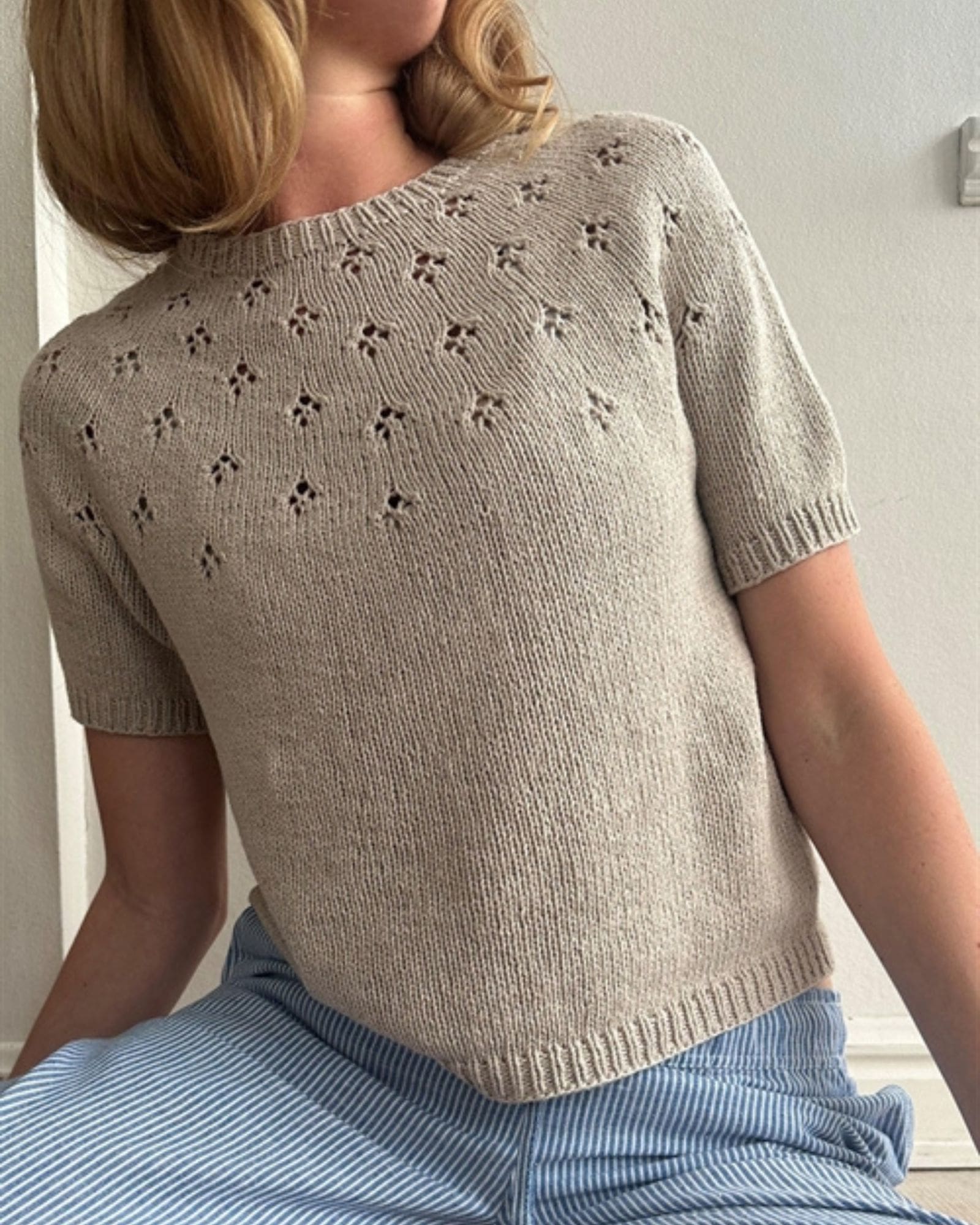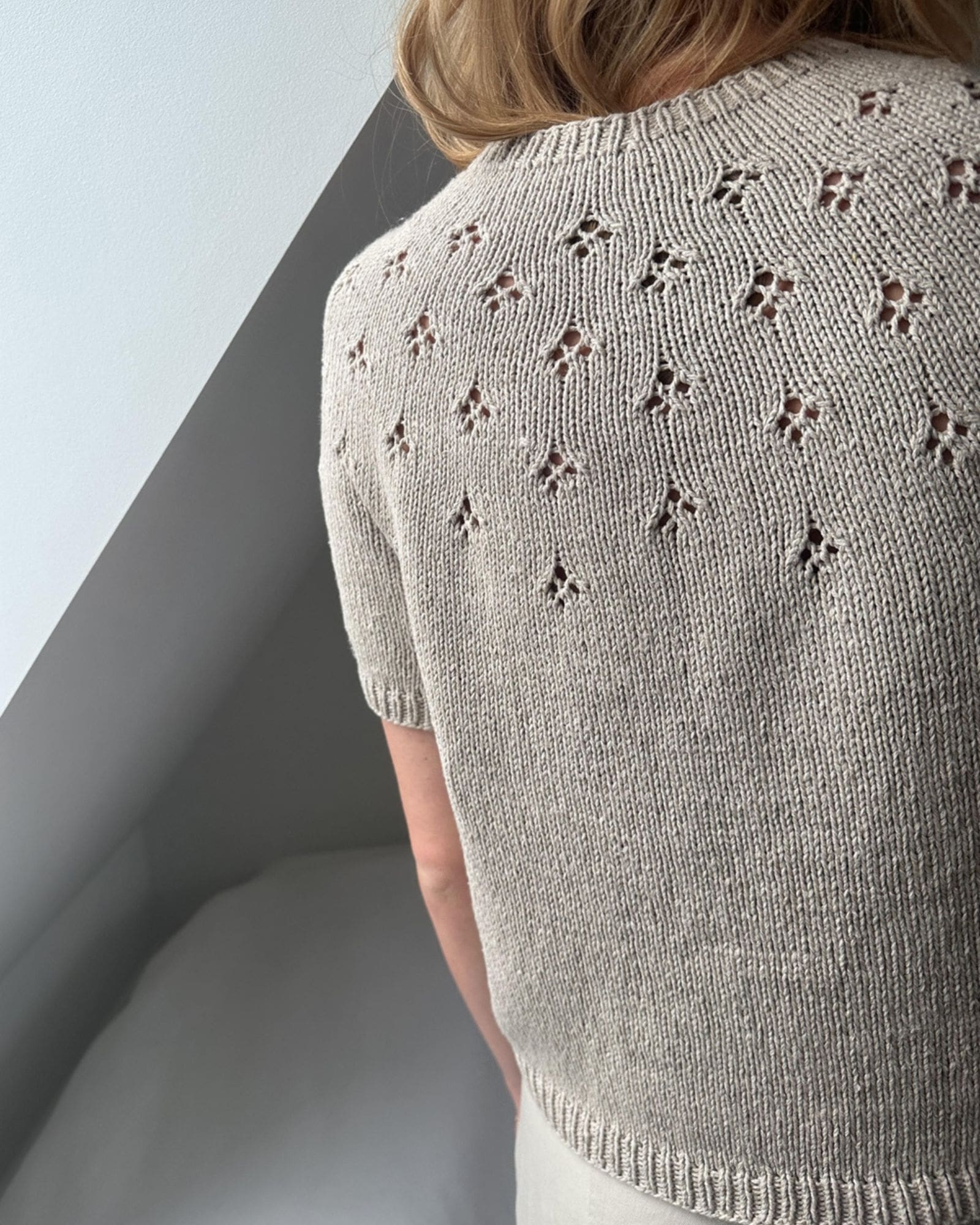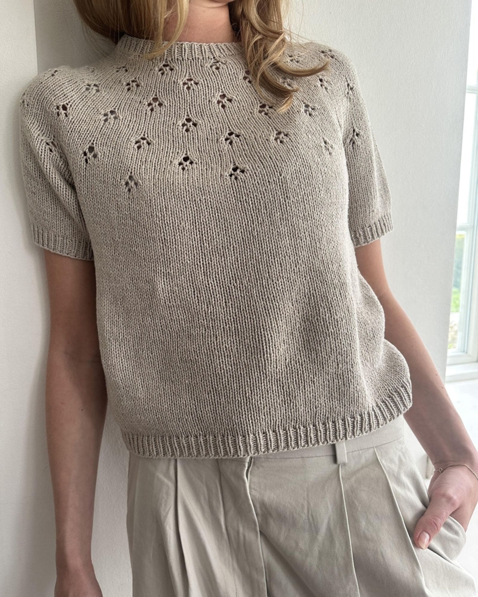 Clover Tee har et lille fint og enkelt kløverhulmønster på det runde bærestykke, men er ellers helt enkel i glatstrik og med smalle ribkanter. Clover Tee strikkes oppefra, så du bestemmer selv længden på ærmer og krop. Der er vendepinde øverst, så halsudskæringen får en fin pasform.