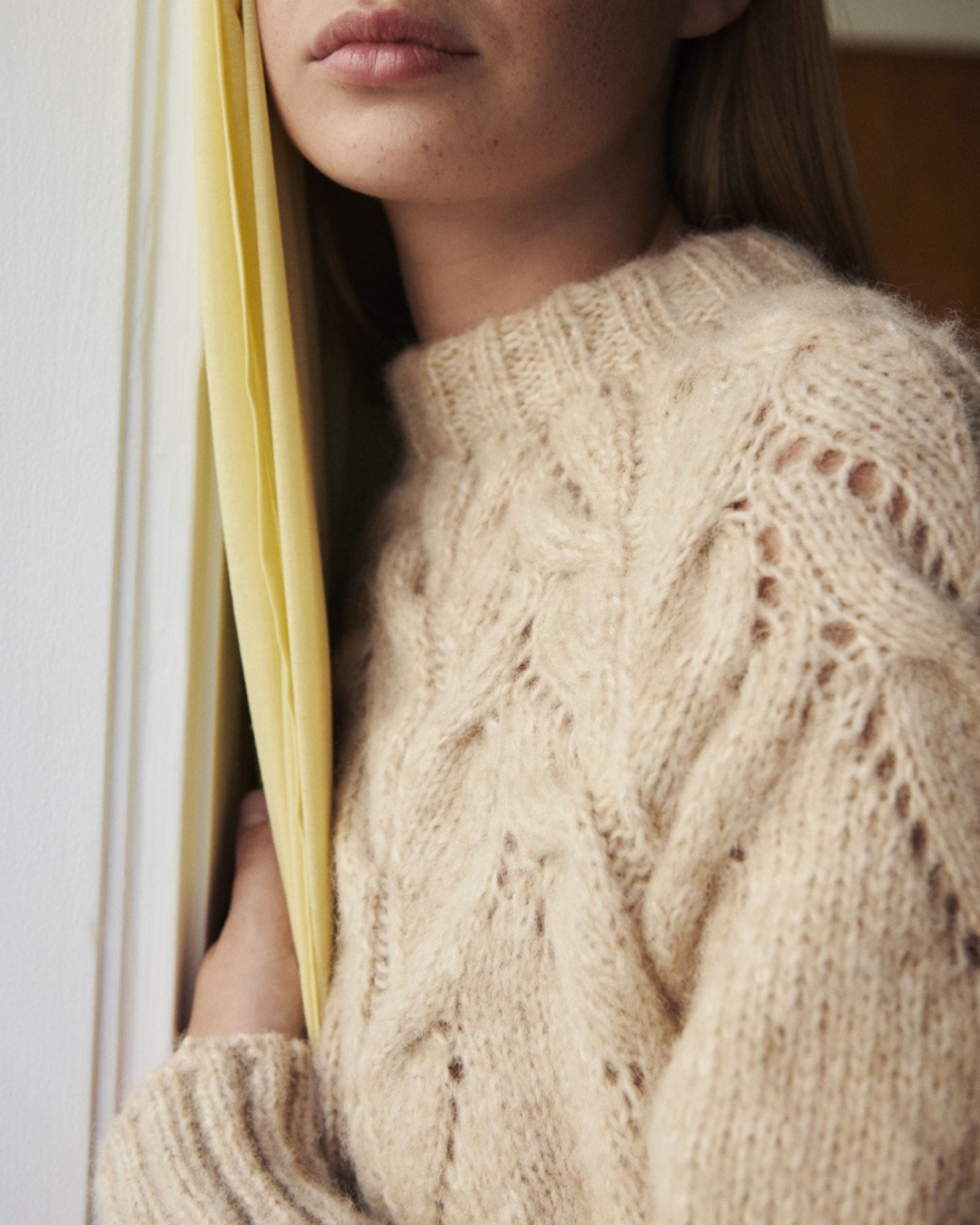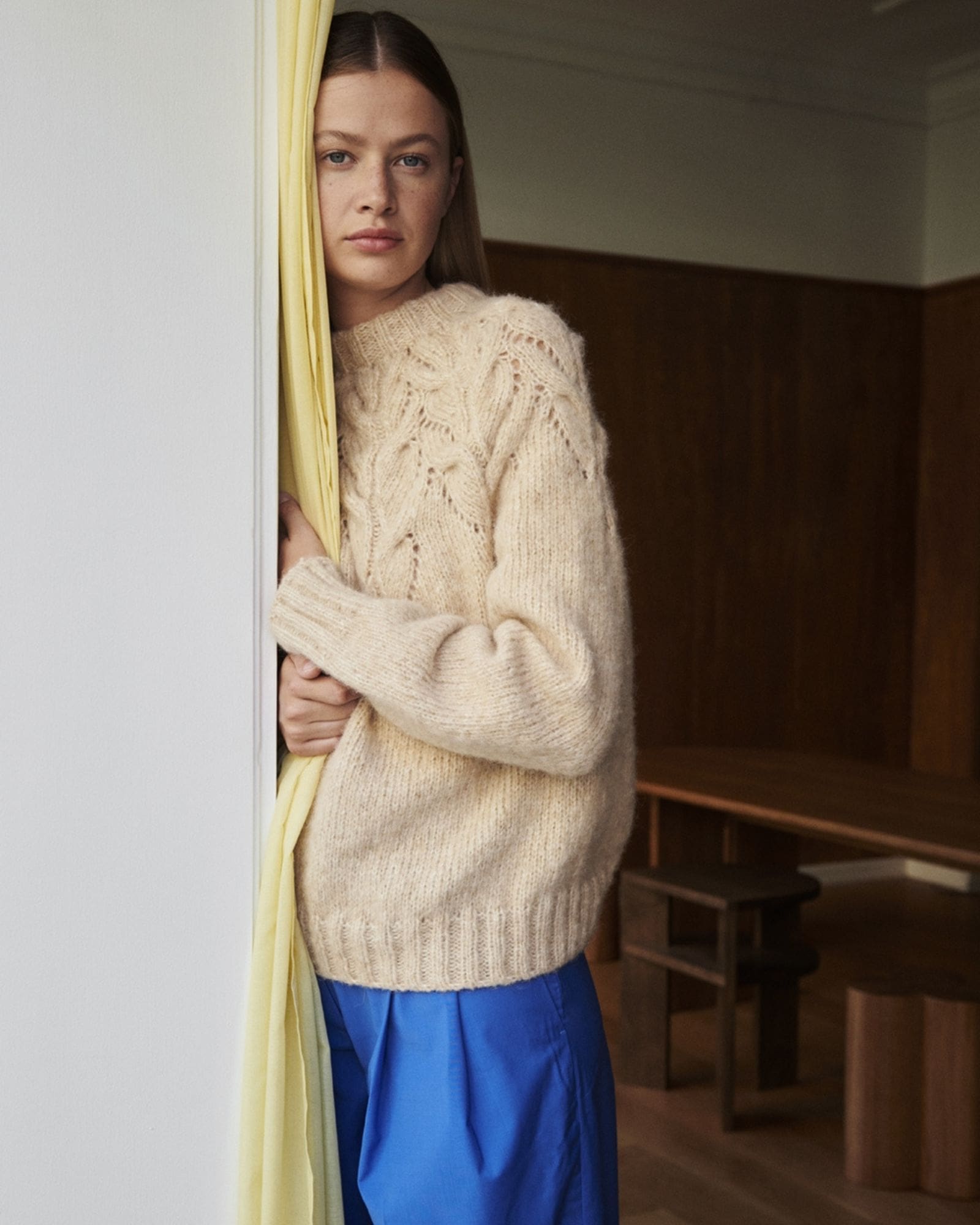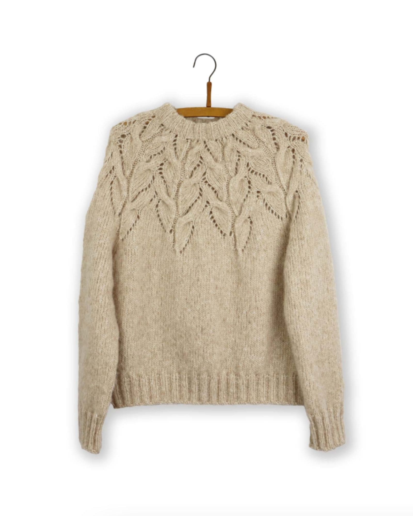 Efeu Sweater fra Lene Holme Samsøe har et chunky bladmønster på bærestykket, der skabes ved hjælp af indtagninger, udtagninger og enkelte snoninger. Sweateren strikkes oppefra, og både mønster og facon dannes, når man blot følger diagrammet. Efeu sweater er derfor et både underholdende og forholdvist enkelt strikketøj.