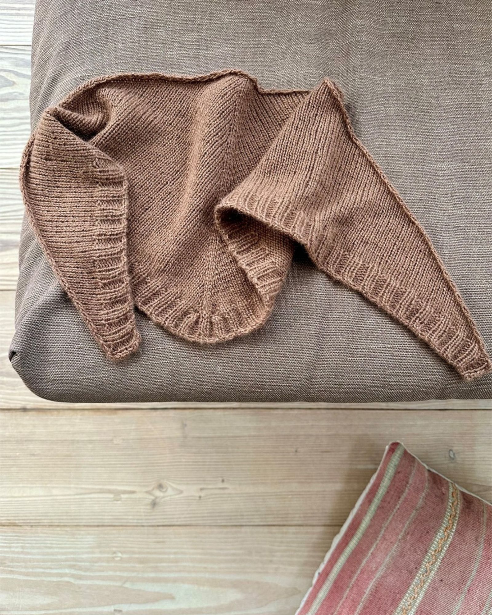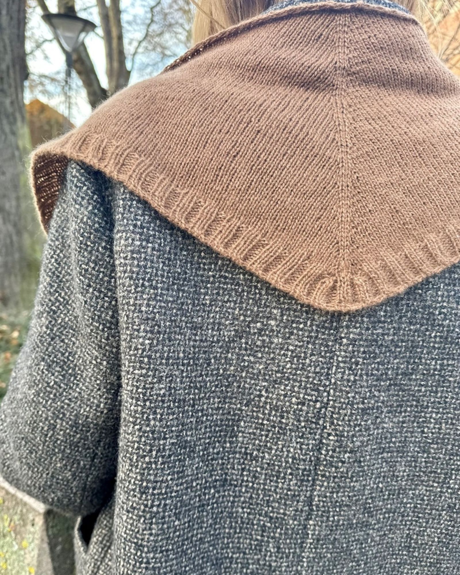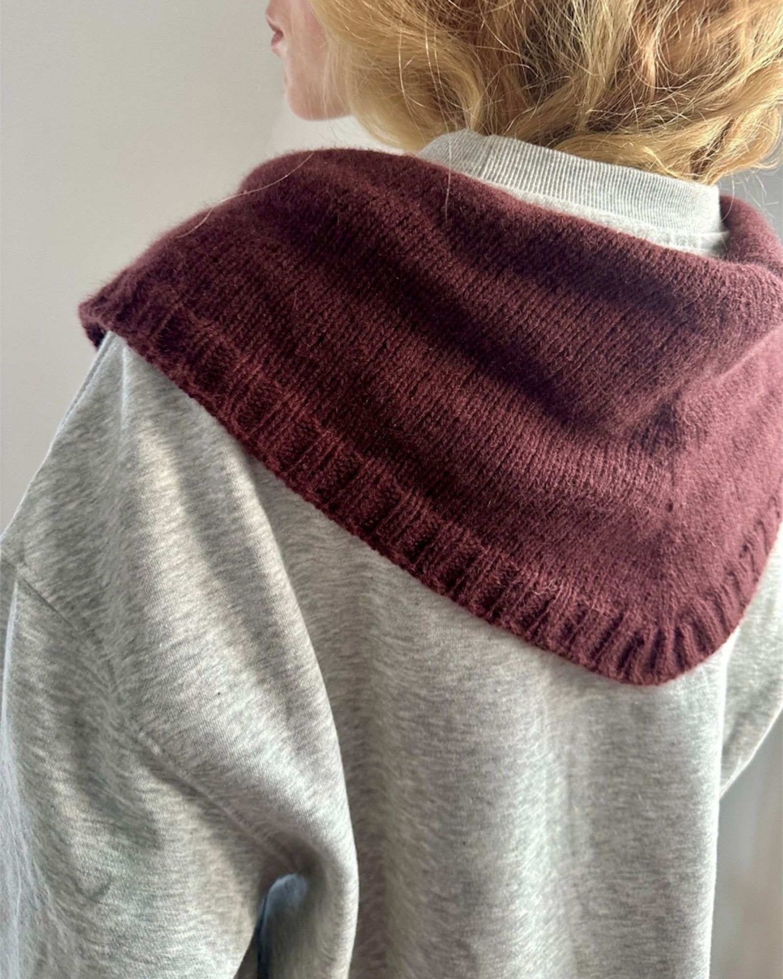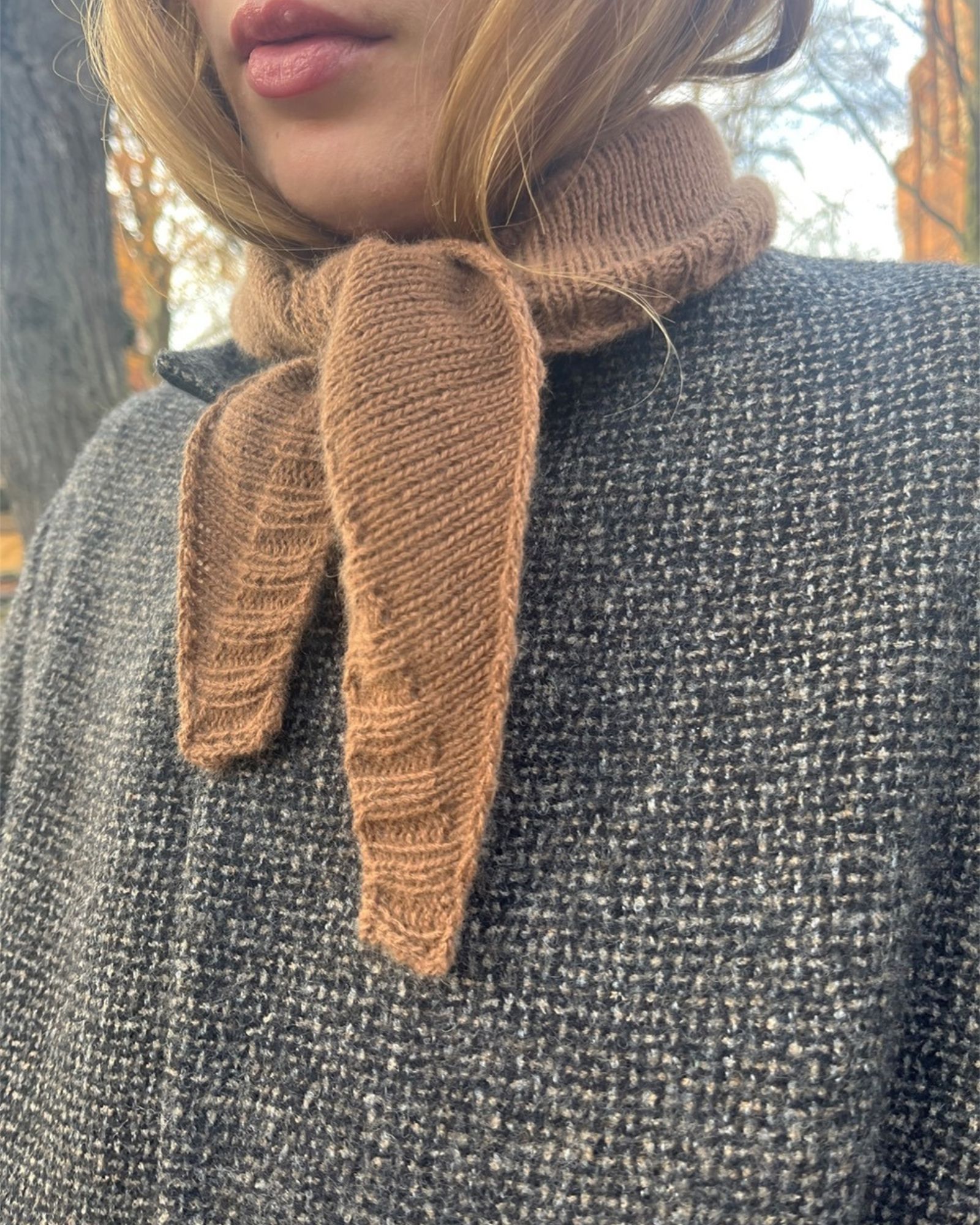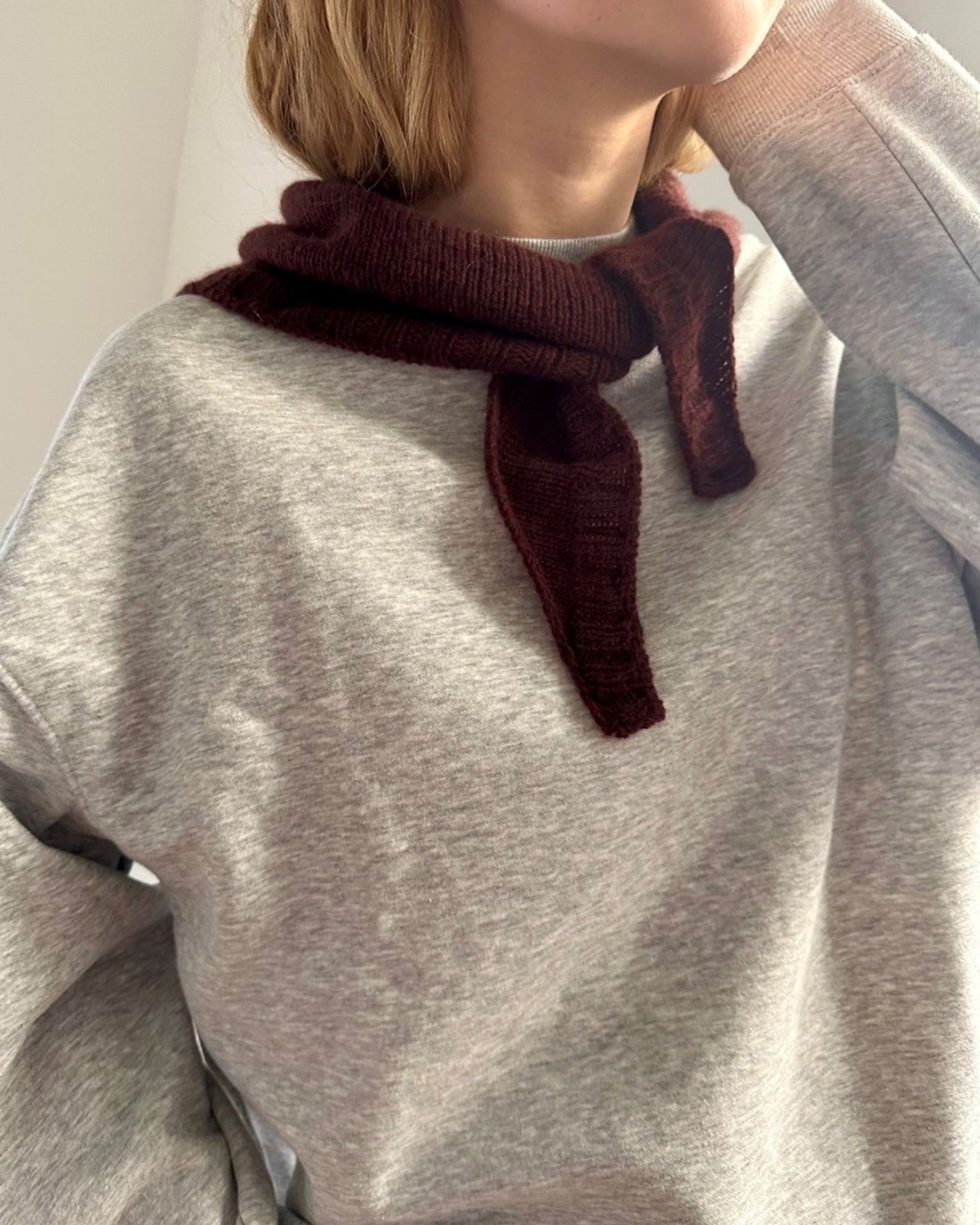 På billederne ses et Note Bandana strikkes i Cardiff Cashmere Classic i fv. 700 Futon.