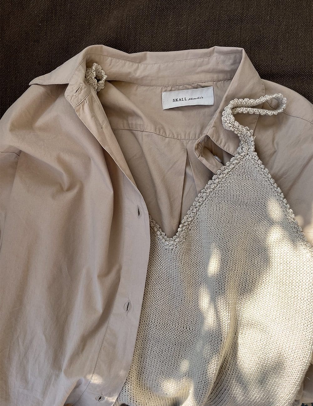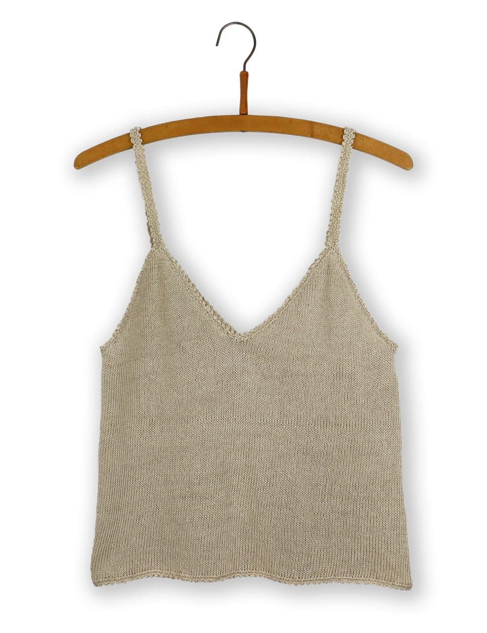 Pebble top minder om en delikat silkecamisole og den får et fint fald i det ”crispy” garn. Glatstrik og en klassisk facon er kombineret med en smal hæklet kant, der giver en lækker kontrast til det glatstrikkede. Toppen strikkes oppefra og kanter og stropper hækles til sidst. Der er kun brugt helt enkle hæklemasker, så du behøver ikke den store erfaring, for at kunne hækle den lille picotkant.