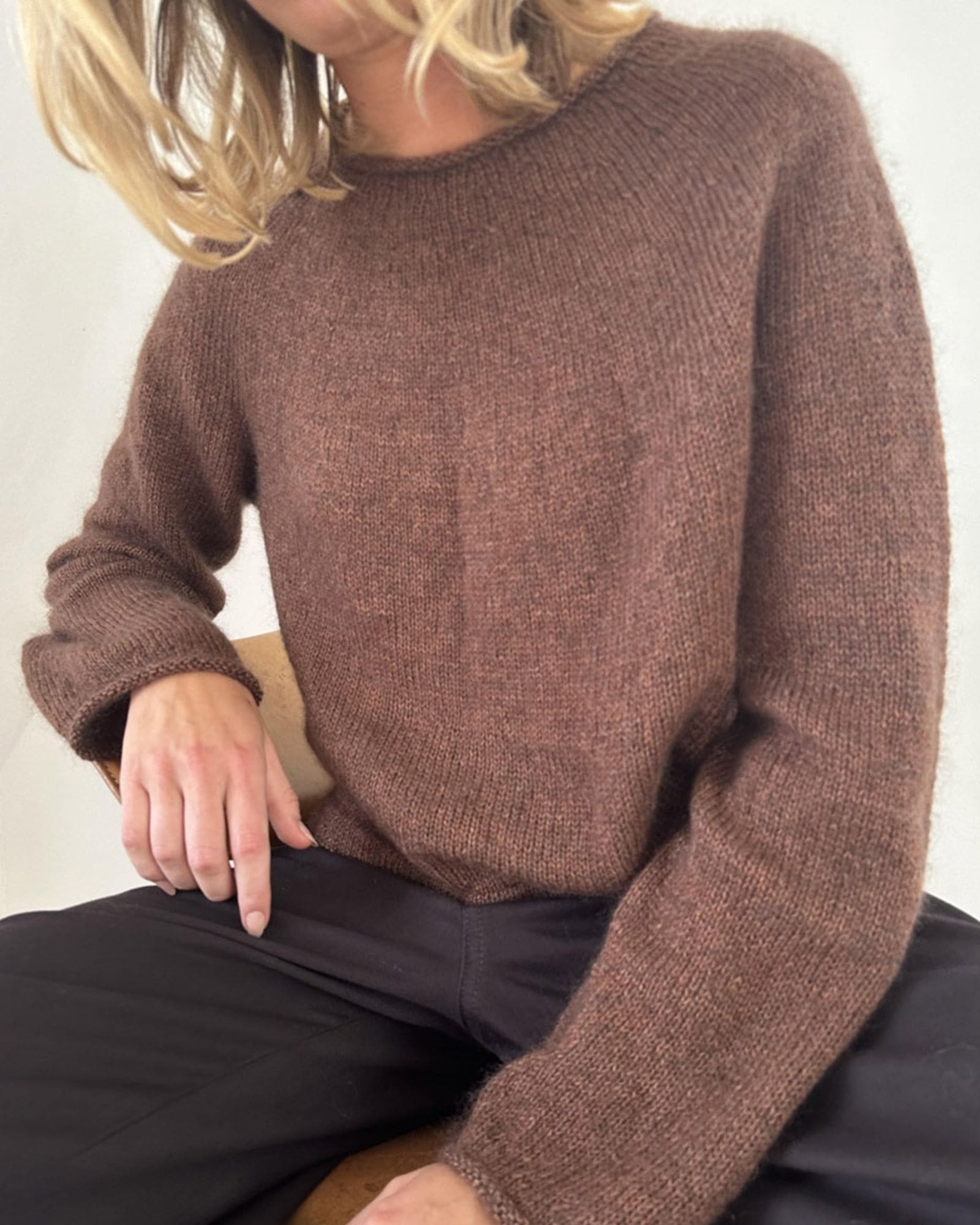 Plain Yoke Blouse er glatstrikket og helt enkel – også at strikke. Den dobbelte kant nederst giver en smuk afslutning og et fint fald. Ærmer og halskant har en glatstrikket rullekant. Opskriften indeholder både Detailed Edition og den endnu nemmere Debutant Edition uden vendepinde i halsudskæringen.