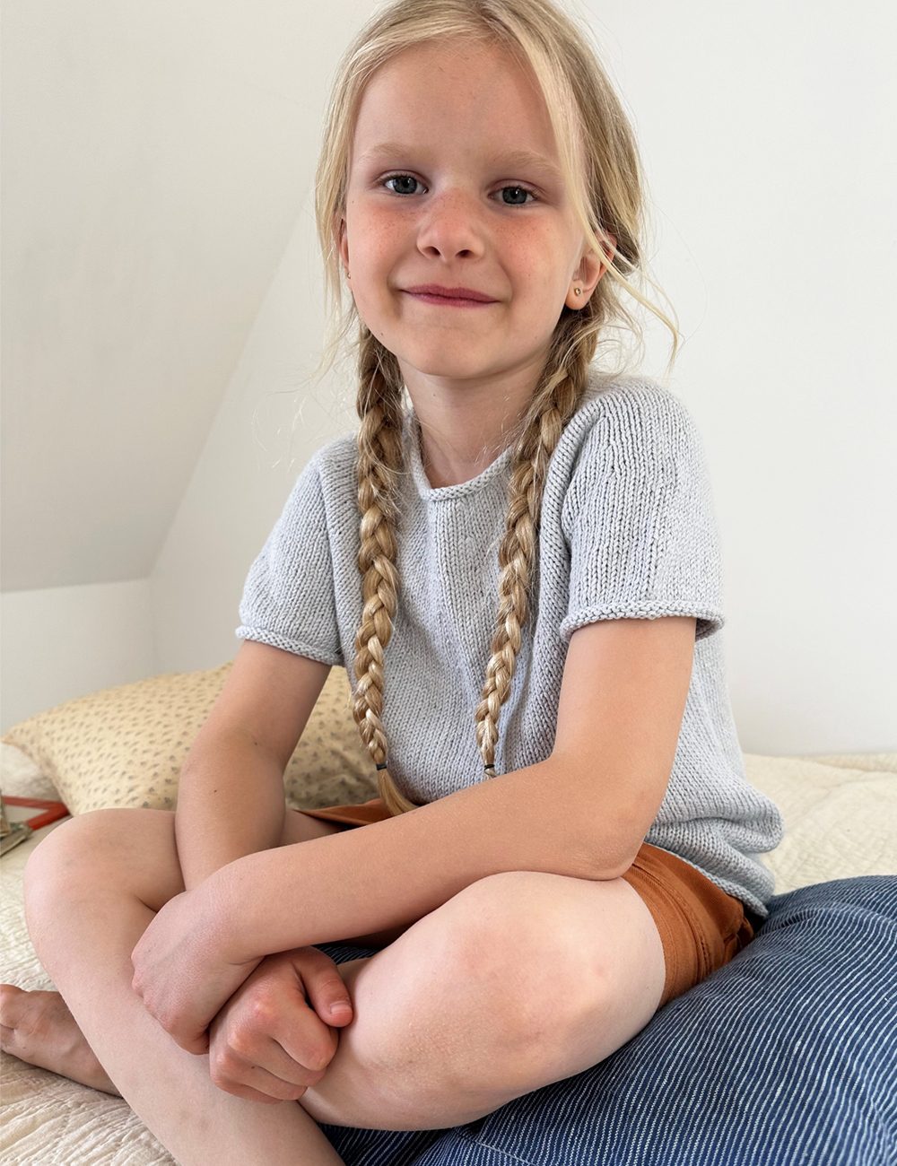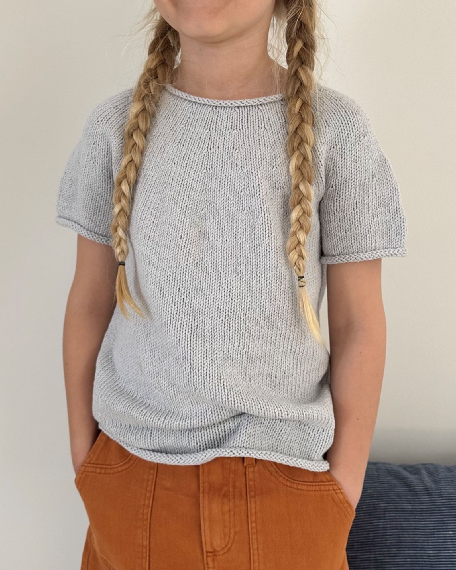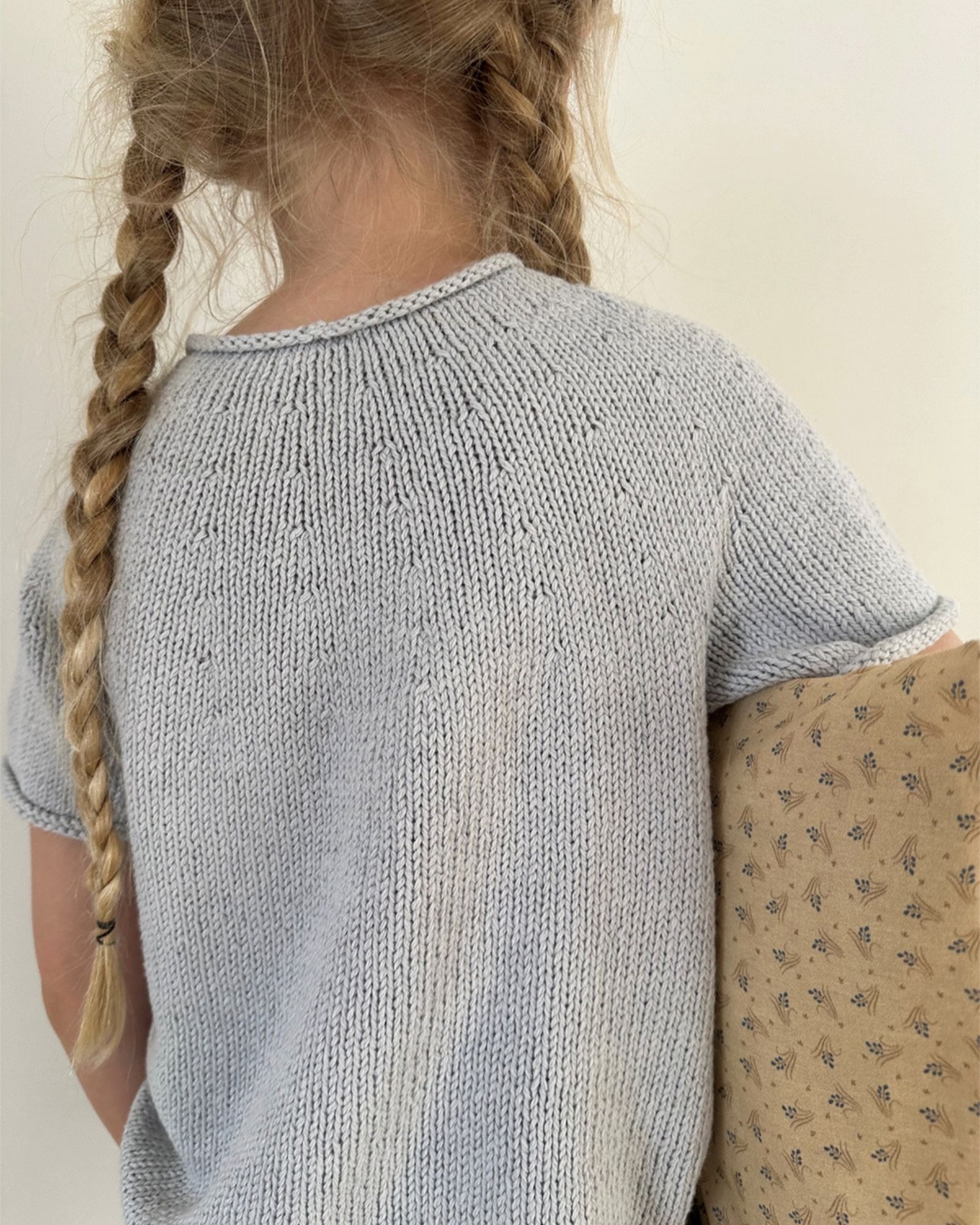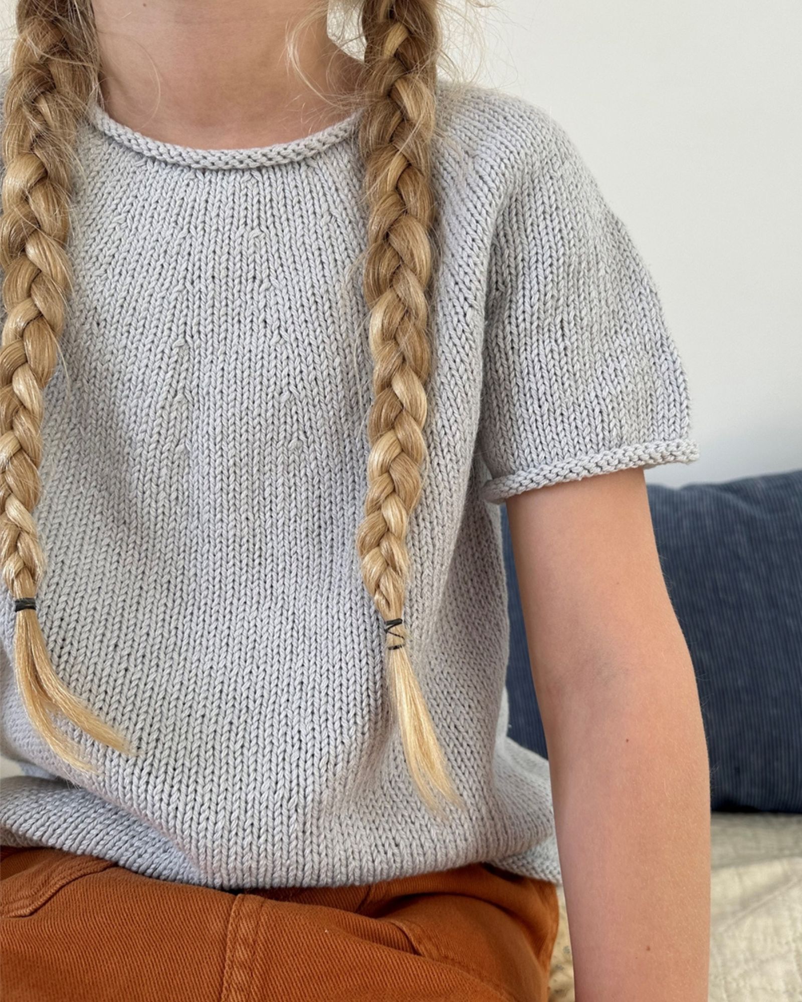 Plain Yoke Tee 20 Junior fra Lene Holme Samsøe er glatstrikket og meget enkel. Den er også virkelig enkel at strikke. Er du helt begynder, kan du eventuelt undlade vendepindene i nakken, så du udelukkende skal strikke rundt. Følg så opskriften til debutant-versionen, der strikkes udelukkende med retmasker. Detailed Edition har vendepinde i nakken og dermed en halsudskæring, der er dybere foran end bag, hvilket giver en finere facon til halsen. Derudover er de to udgaver ens. Du kan finde relevante videoer til denne opskrift nederst på siden.