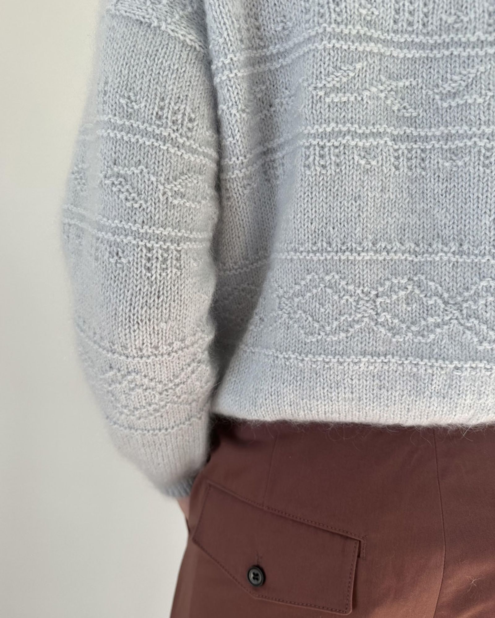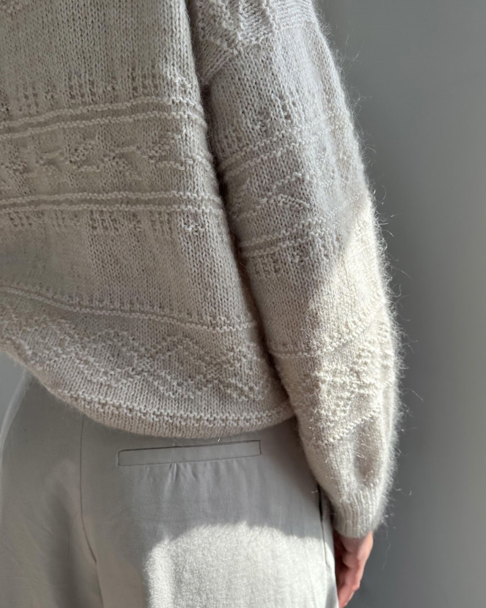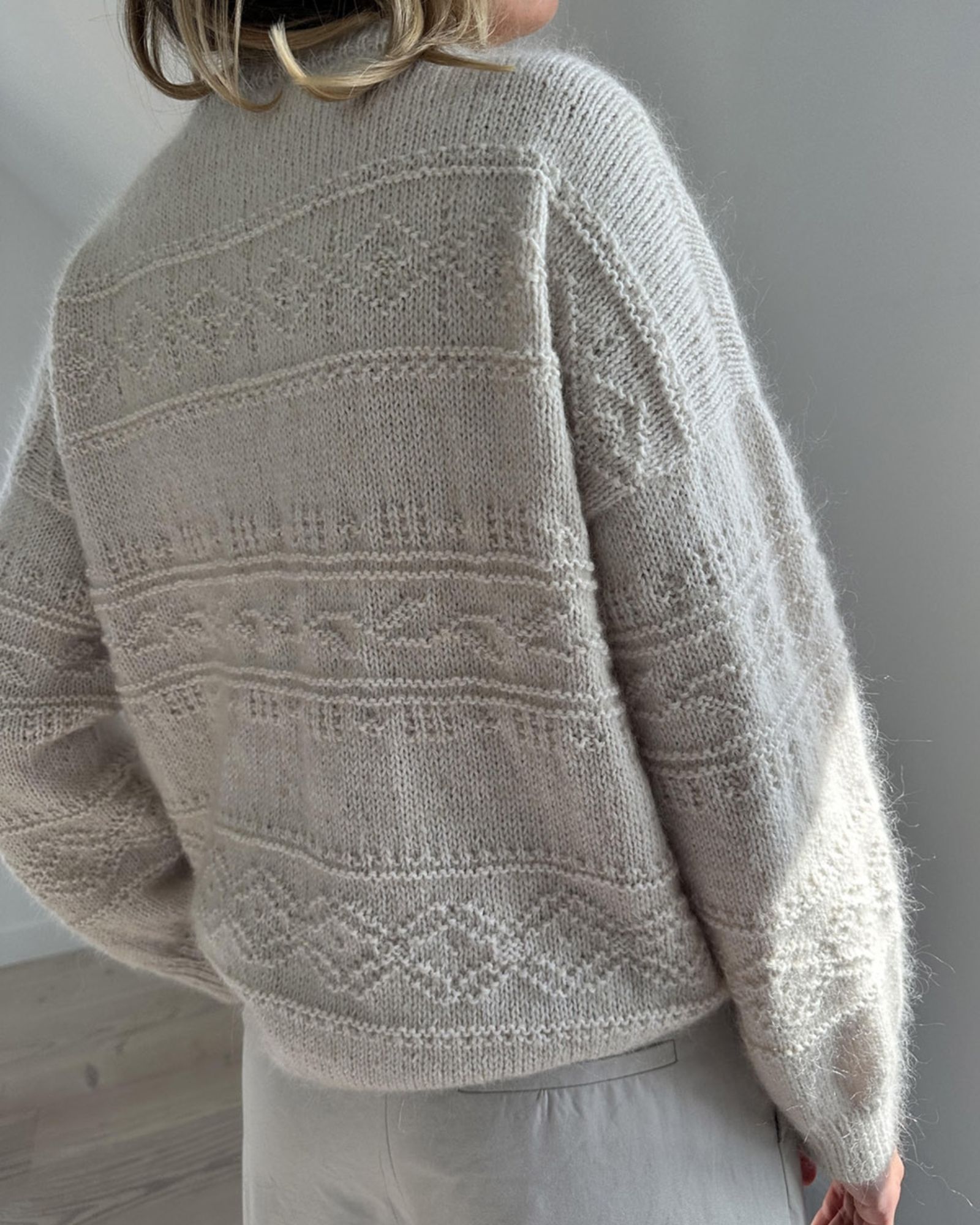 Porcelain Damask Sweater har 3 smukke borter på kroppen og 2 på ærmerne. Mønsterborterne strikkes efter diagram, udelukkende med ret- og vrangmasker. Mellem borterne strikkes glatstrik. Porcelain Damask Sweater strikkes oppefra med skrå skuldre og lige tilsatte ærmer.