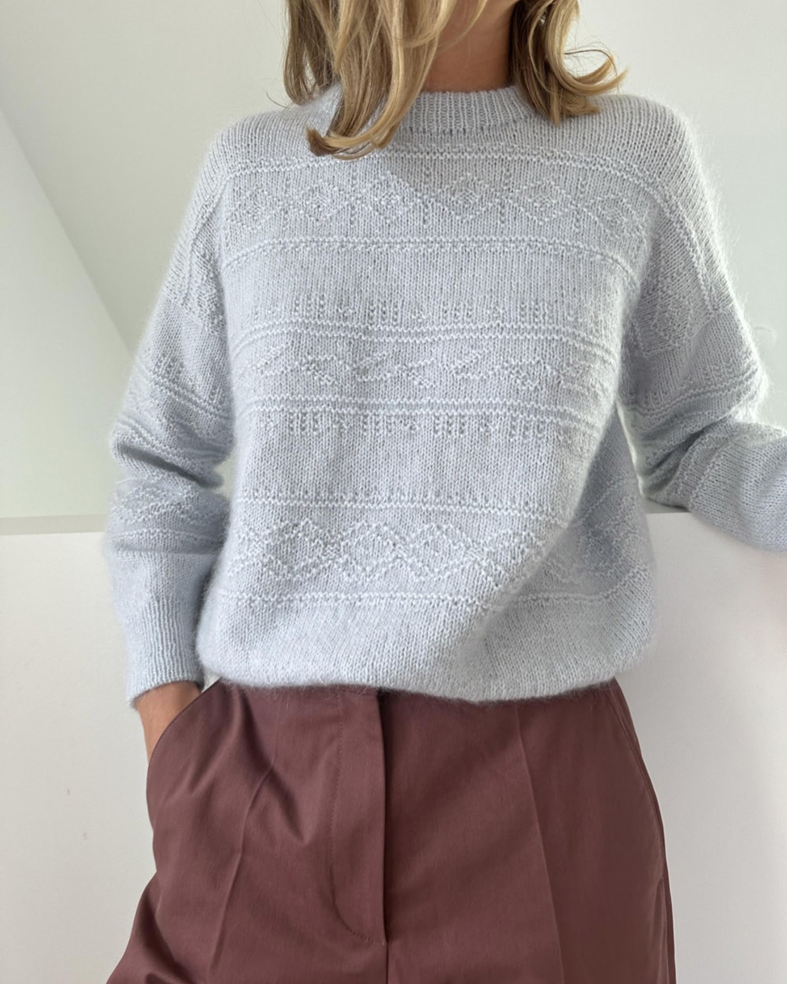 Porcelain Damask Sweater er tænkt til at have et bevægelsesrum på ca. 15-25 cm. Den vises her med et bevægelsesrum på 17 cm (lyseblå sweater). Sweateren er altså vist på en model med en overvidde, der er 17 cm mindre end sweaterens overvidde. Sweateren vist i natur har et bevægelsesrum på 22 cm.