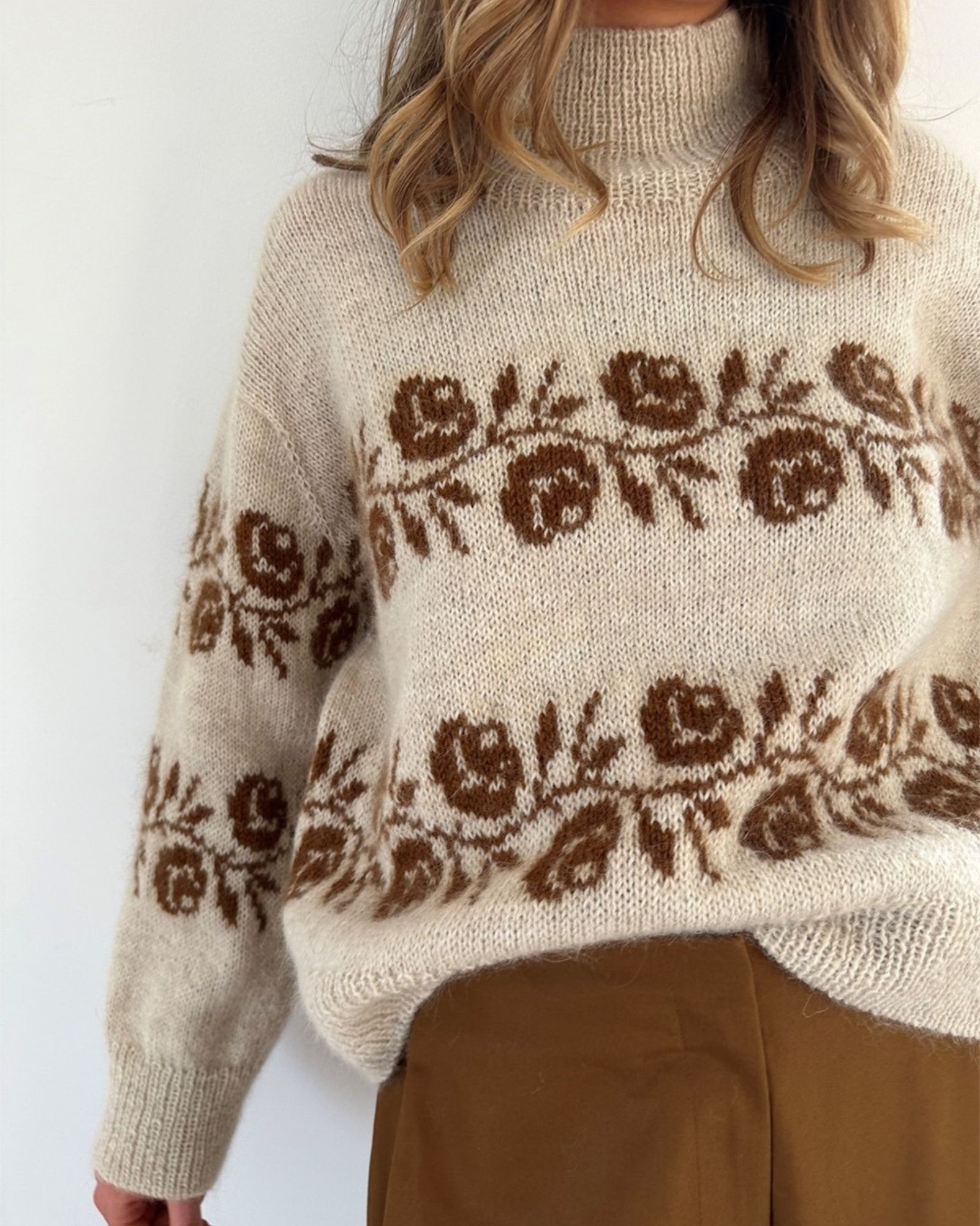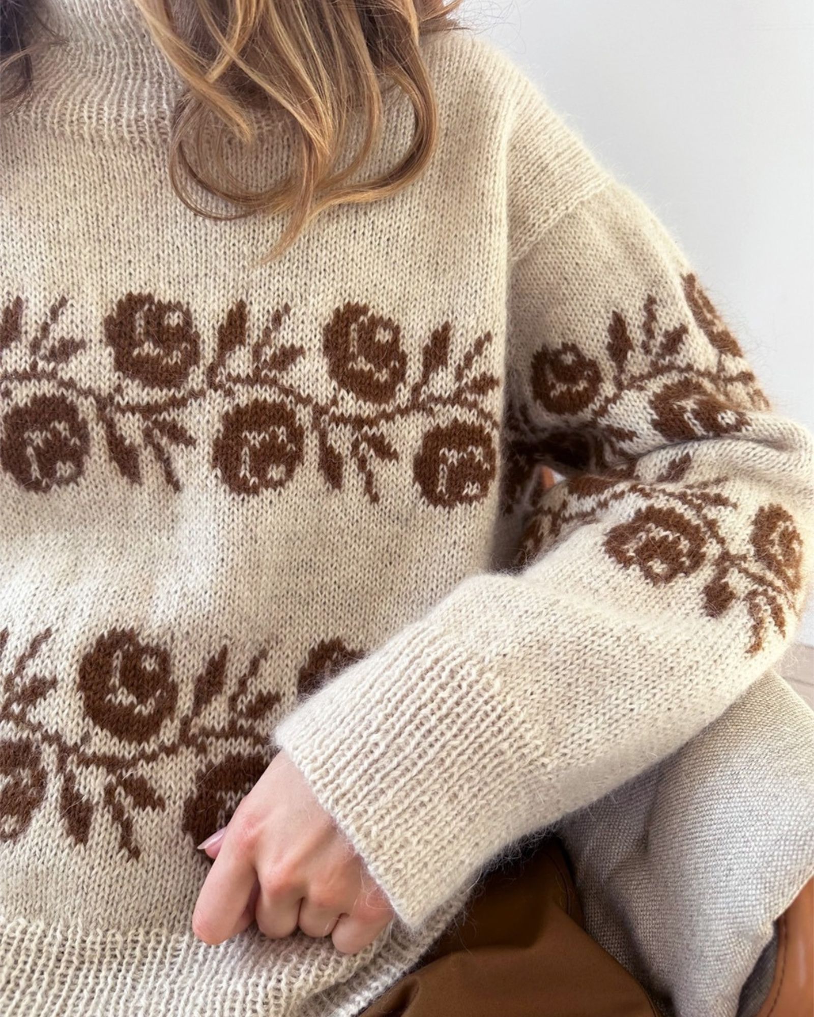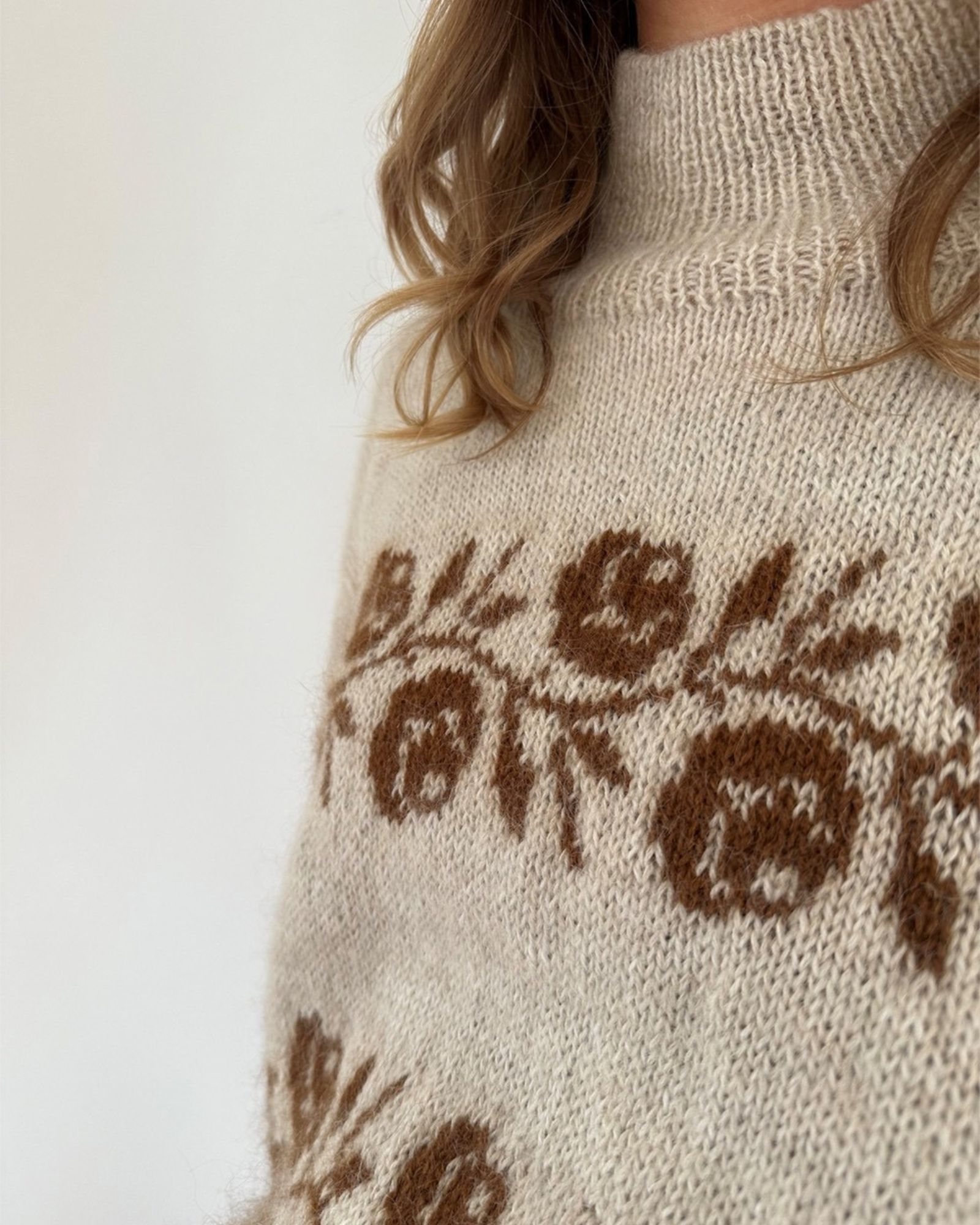 Rosie Sweater af Lene Holme Samsøe har to rosenborter på krop og ærmer, og den snedige konstruktion er en kombination af ærmekuppel og raglan, som betyder at al mønster kan strikkes rundt fra retsiden.