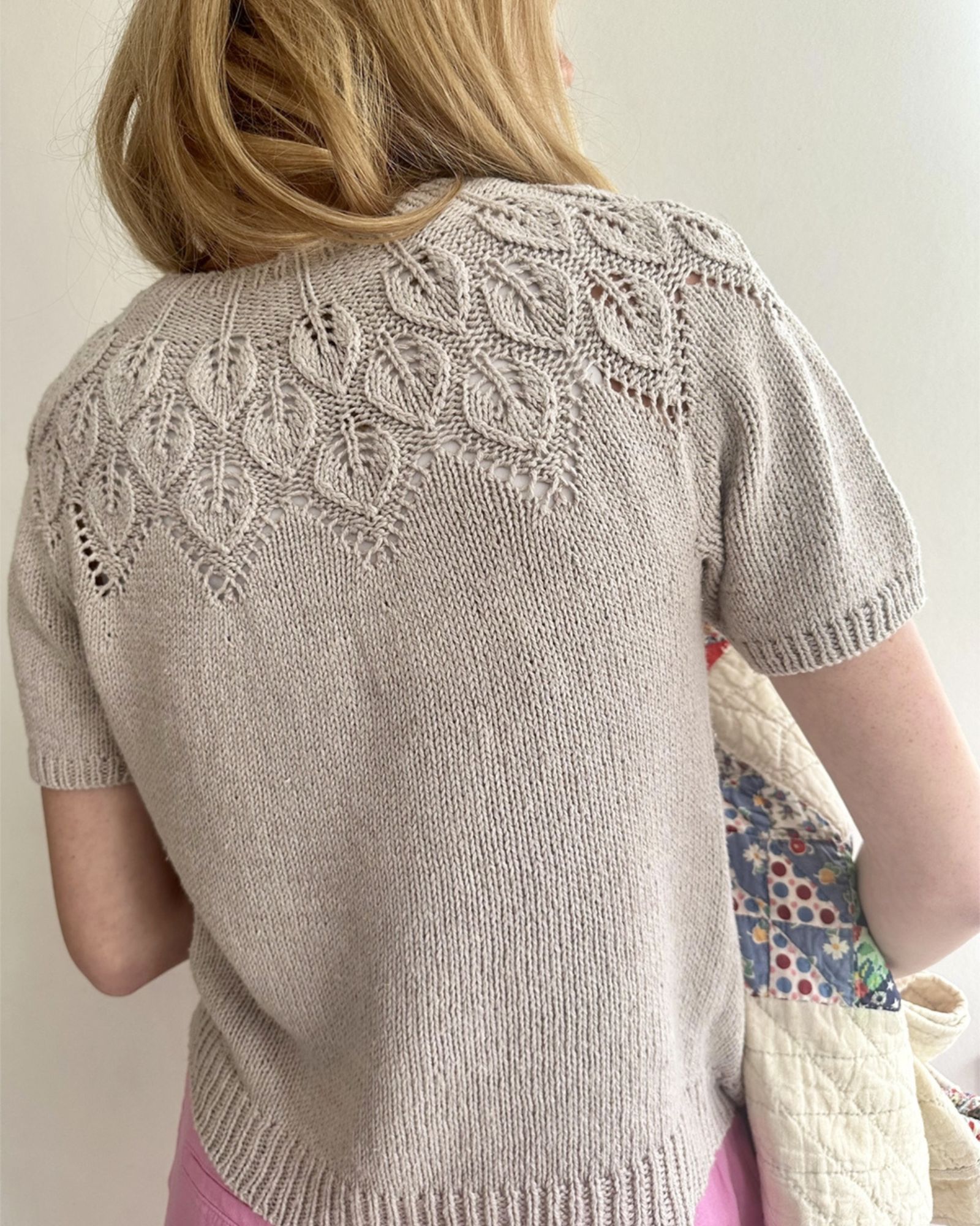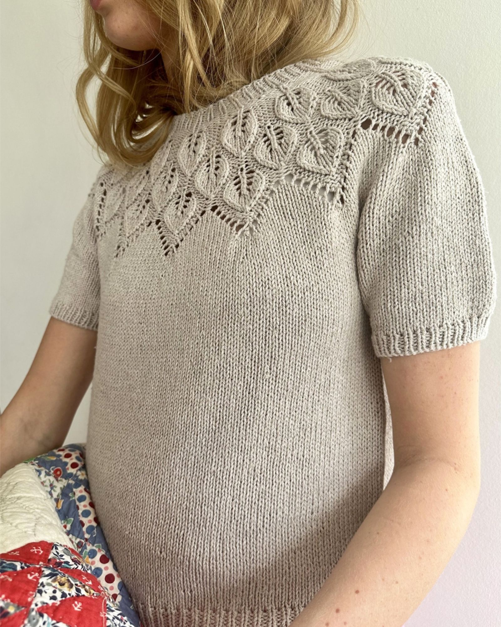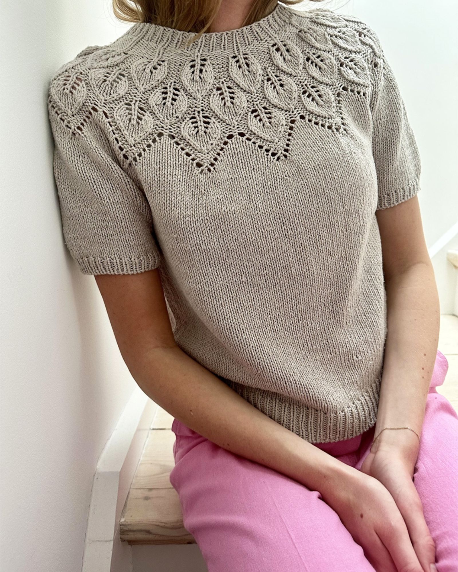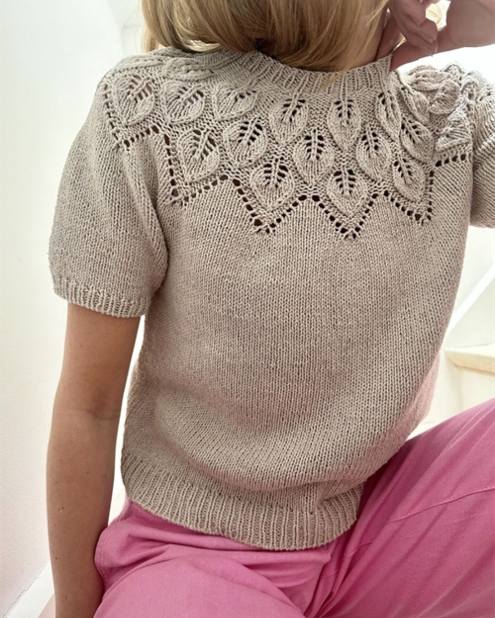 Sommer Ella fra Lene Holme Samsøe er en strikket t-shirt. Det bladmønstrede bærestykke er underholdende at strikke, og giver også en fin pasform, fordi kombinationen af ret- og vrangmasker er så elastisk. Sommer Ella er strikket oppefra og ned, og er strikket højere bag end for. Den er kort og lidt løstsiddende.