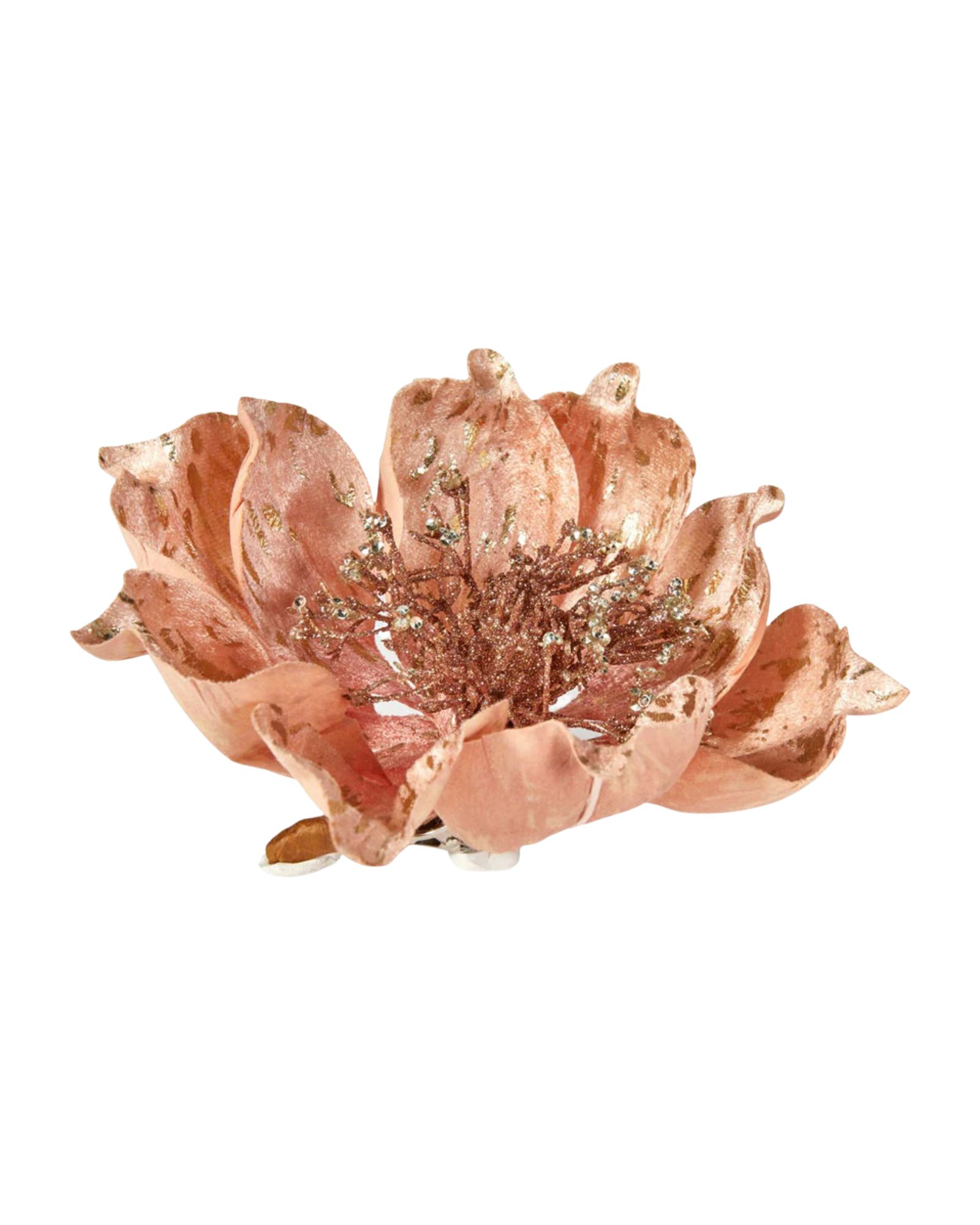 Denne dekorative blomst i rosa med fine guldeffekter giver et smukt og stemningsfuldt udtryk i hjemmet. Blomsten måler 12 cm og er udstyret med en praktisk clips ved stilken. Det gør den nem at sætte fast på juletræet, i en forårsdekoration eller som pynt i hjemmet året rundt. Den elegante finish og de let glitrende detaljer giver et eksklusivt og dekorativt look, der passer til både højtider og hverdag.