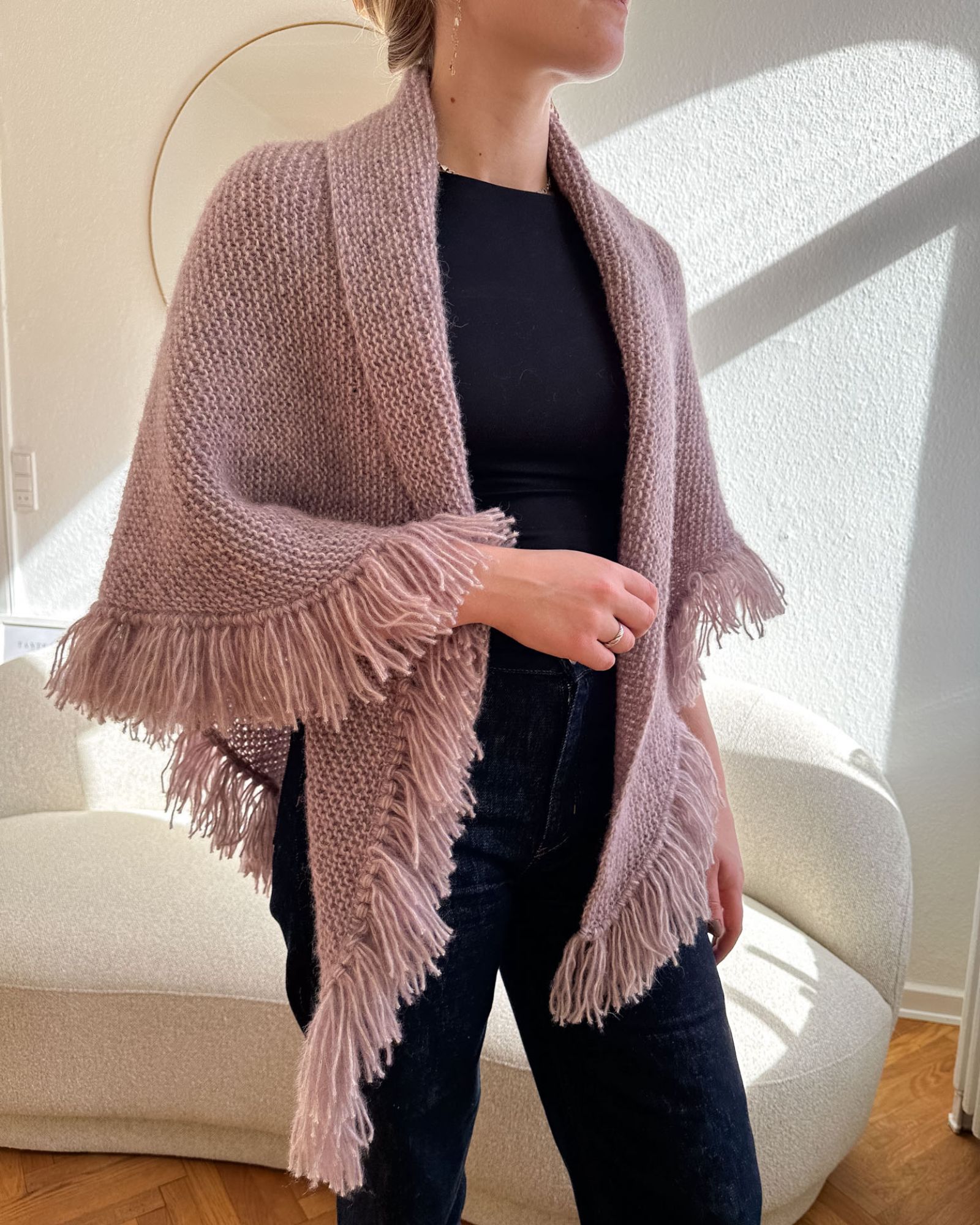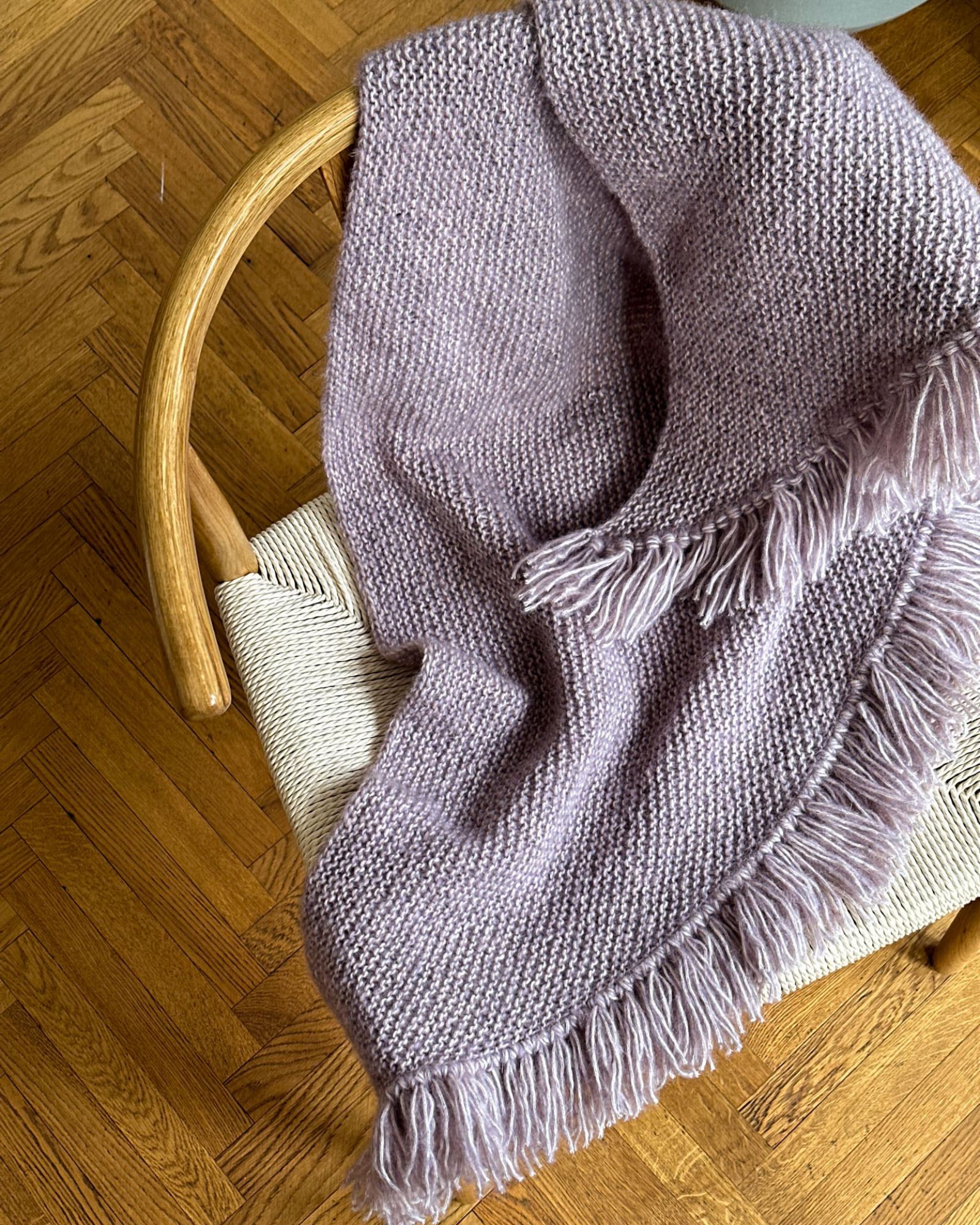 Det lyselilla Marianne Shawl er strikket i Moon i farve 126 Powder.