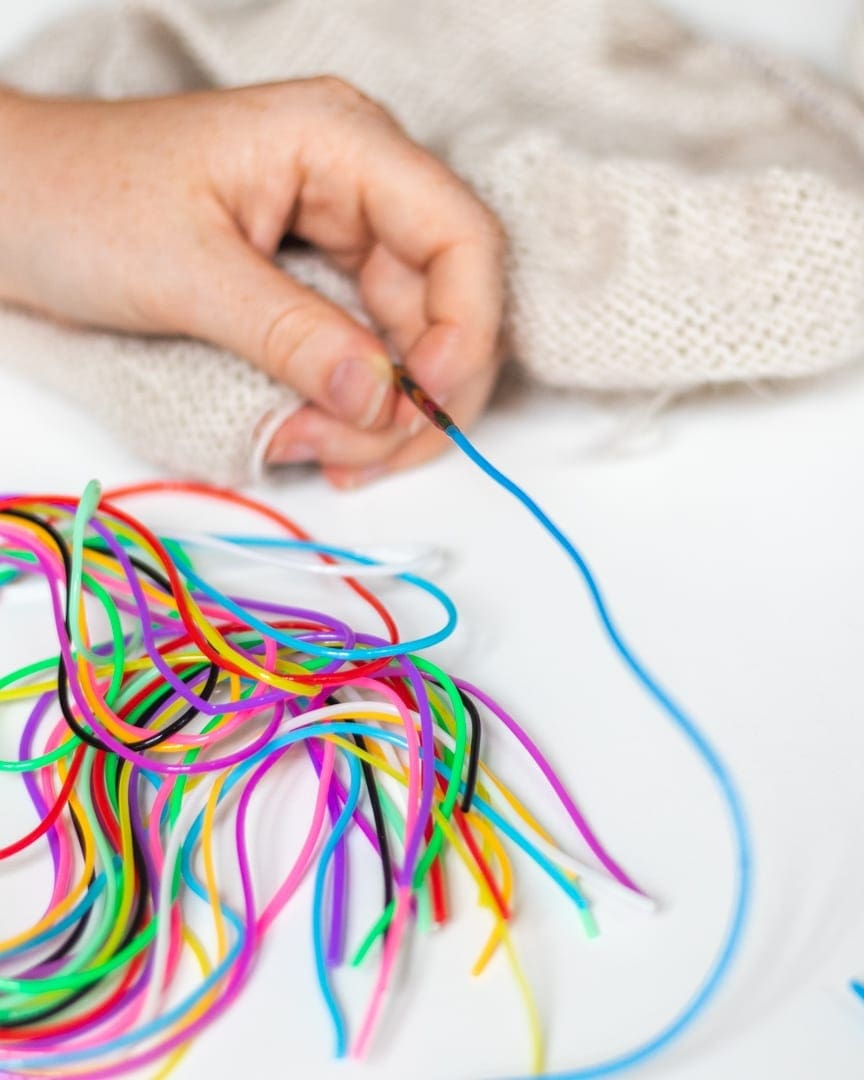 Brug fx maskewiren når maskerne til et ærme skal hvile. Sæt wiren ind på spidsen af rundpinden og træk maskerne over på. Bind en knude i hver ende af wiren. Når maskerne skal tilbage på rundpinden igen, fungerer det på samme måde. Du kan også bruge maskewiren, hvis du skal prøve en trøje på der strikkes oppefra og ned.