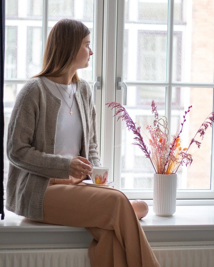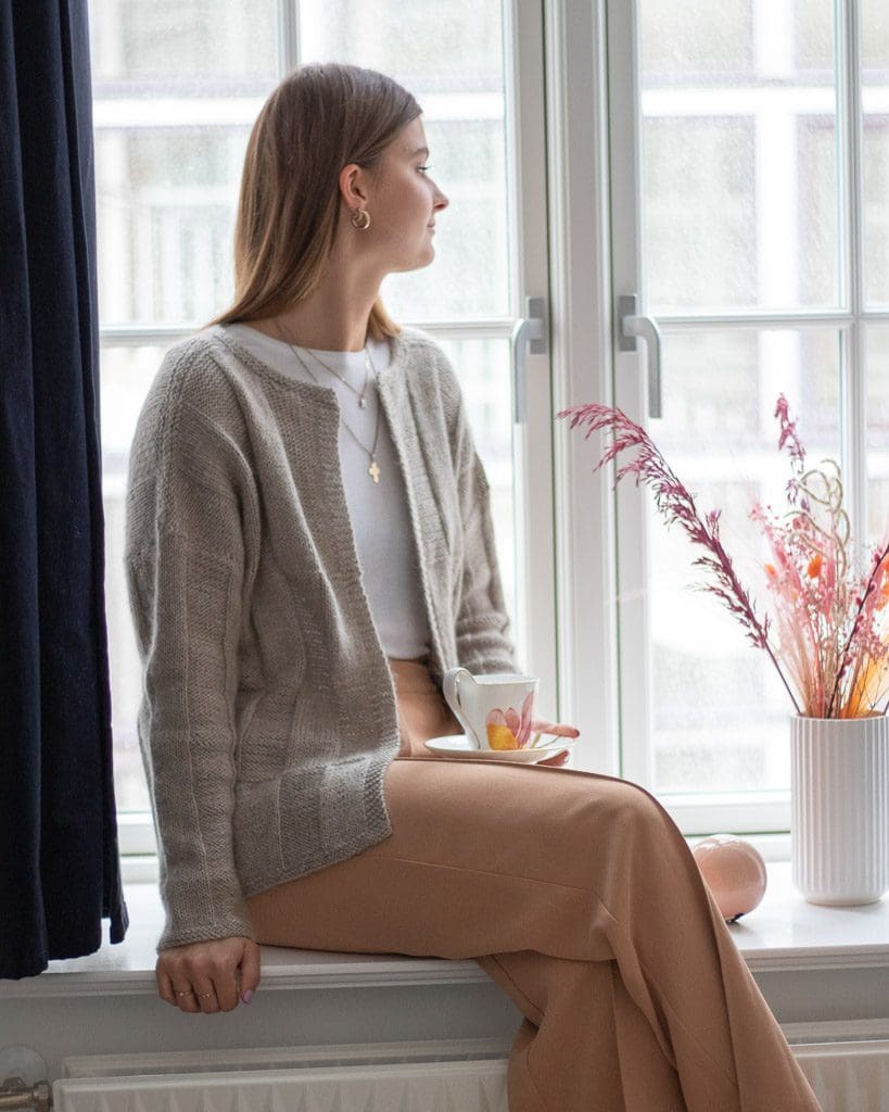 Midnight cardigan strikkes nede fra og op, og er med et lige påsat ærme. Cardiganen er strikket i et smukt ret vrang mønter, ganske enkelt, ment enormt smukt i udtrykket. Der strikkes med to garnkvaliteter, som tilsammen giver en meget blød og lækker cardigan. Det giver også rig mulighed for at sammensætte din egen yndlings nuance.