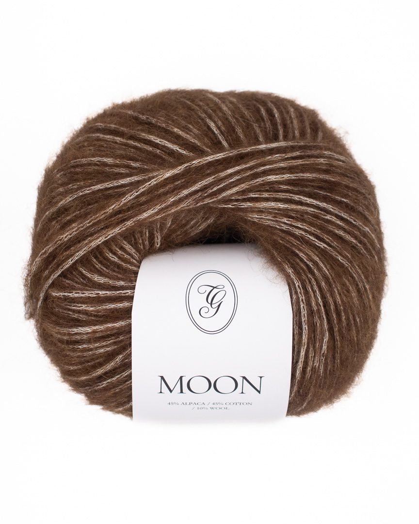 Det hvide bomuldsnet i garnets kerne er blæst fyldt med fine fibre af alpaka og uld. Resultatet er en unik, let meleret struktur, hvor farverne får et diskret spil og et levende udtryk, som om du har strikket med flere tråde i samme tone. Når du strikker med Moon, samler fibrene sig smukt, og det færdige resultat får et roligt, elegant udtryk med et blødt og harmonisk farvespil.
