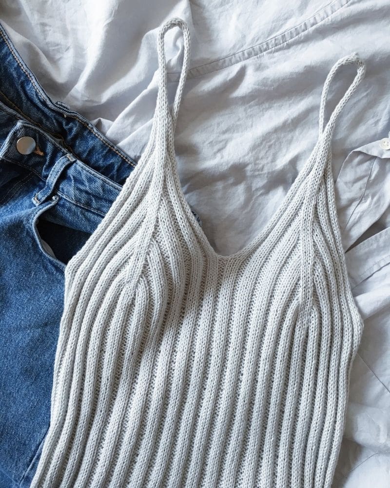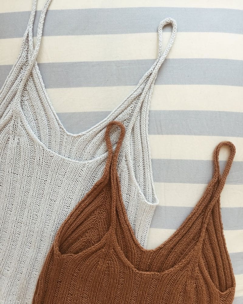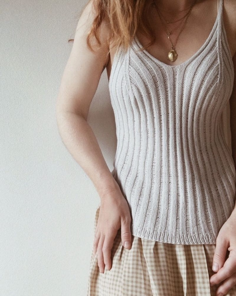 My Favourite Things Knitwear Camisole No. 2 er en feminin sommertop strikket i rib med dekorative indtagninger på bærestykket. Toppen strikkes nedefra og op, og modellen er tænkt med en længde ca. til hoftebenet.