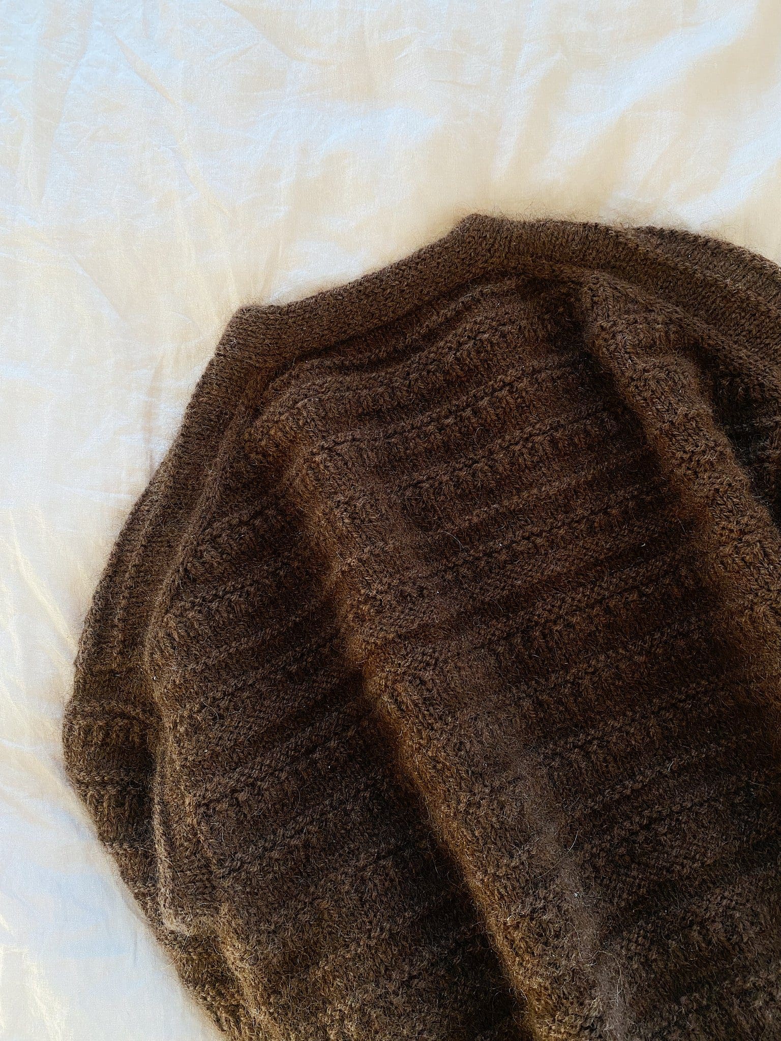 Jacket No. 1 er strikket i strukturmønster dannet med ret- og vrangmasker. Silhuetten er inspireret af 80’ernes voluminøse overdele, og skåret med drop shoulder effekt og en let boxy pasform. Den specielle skulderkonstruktion giver ekstra kant og særpræg. Arbejdet strikkes oppefra og ned og er monteringsfrit.