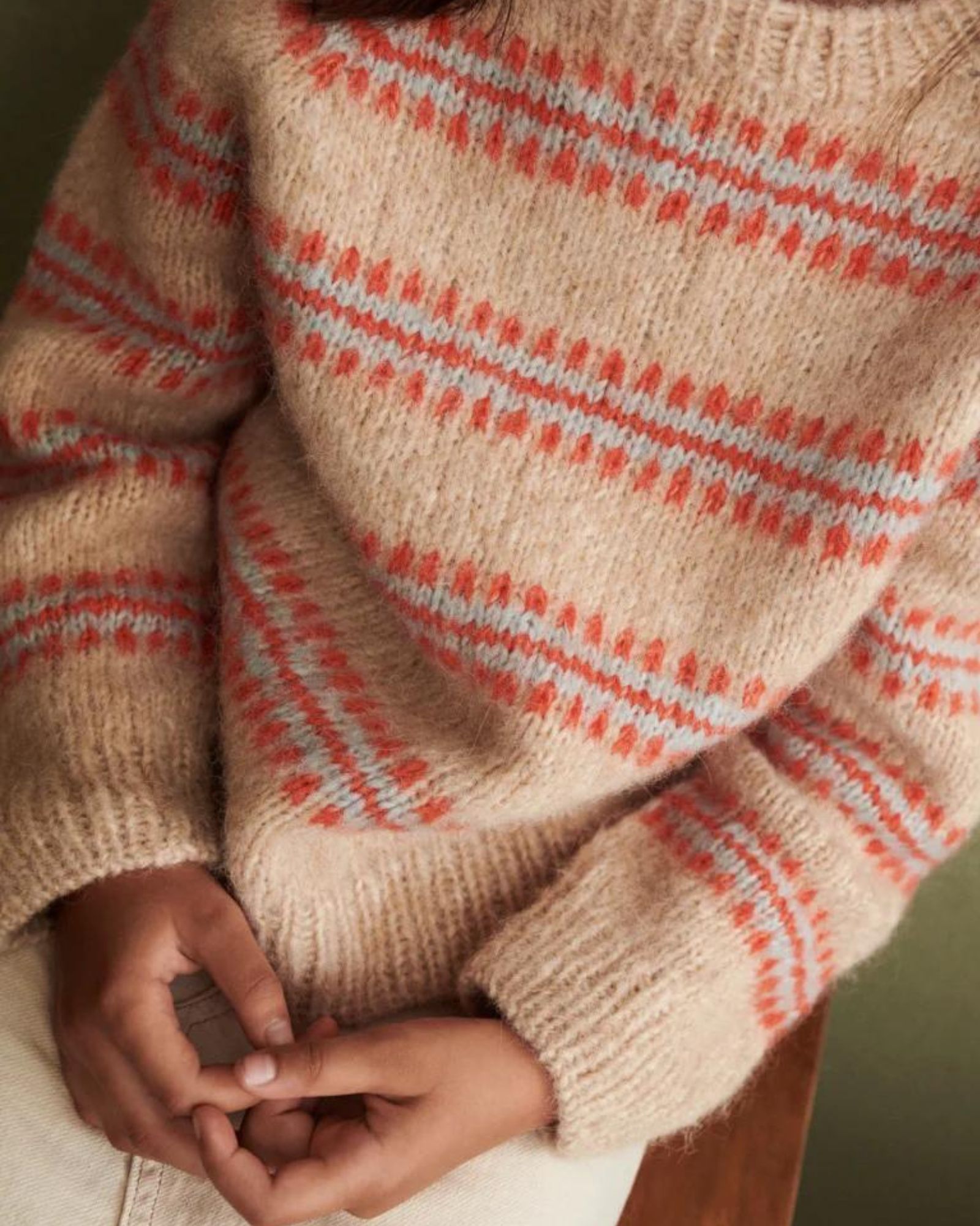 Little Norma Sweater er en klassisk raglan sweater. En tidløs strik med et smukt fald og en behagelig løs pasform. Halsudskæringens form dannes med vendepinde efter ribkanten er strikket. Det simple, men distinkte flerfarvede mønster skaber blikfang og leder tankerne tilbage på 60’er og 70’ernes striktraditioner. Modellen strikkes oppefra og ned, så der er mulighed for at prøve den på undervejs.
