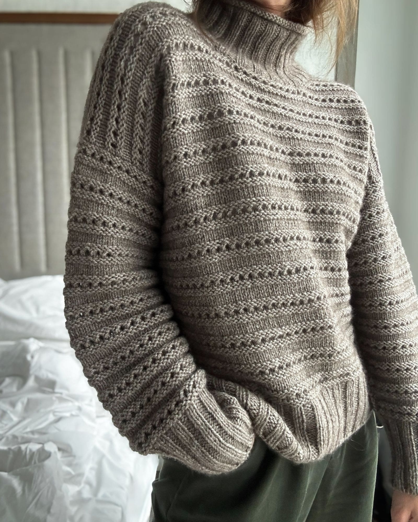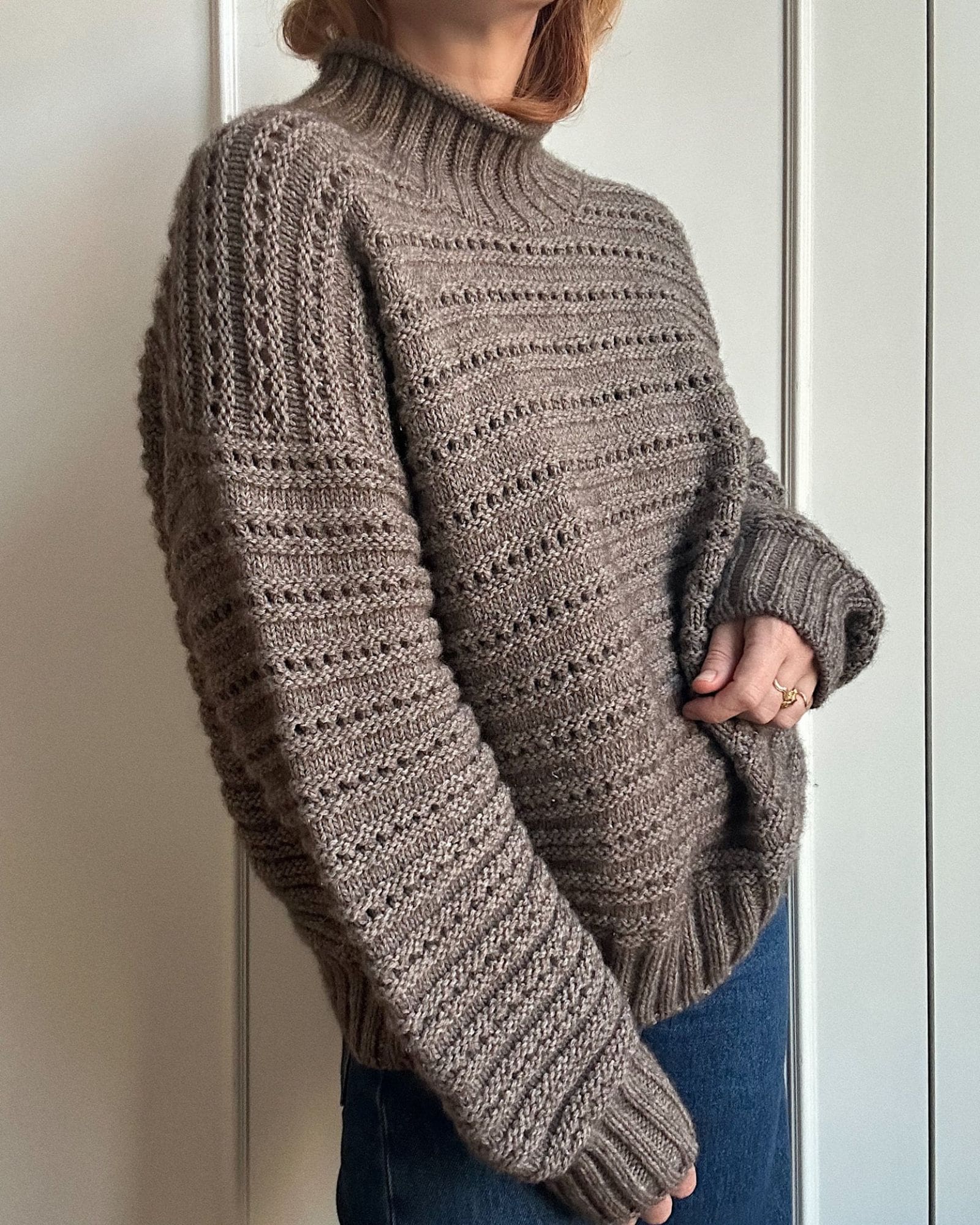 Sweater No. 27 har en oversize pasform. De mindre størrelser har et større positive ease end de største for at komplimentere den enkelte krop bedst muligt. Beregn et bevægelsesrum på ca. 25-30 cm for størrelse XS-L og 20-25 cm for størrelse XL-4XL.