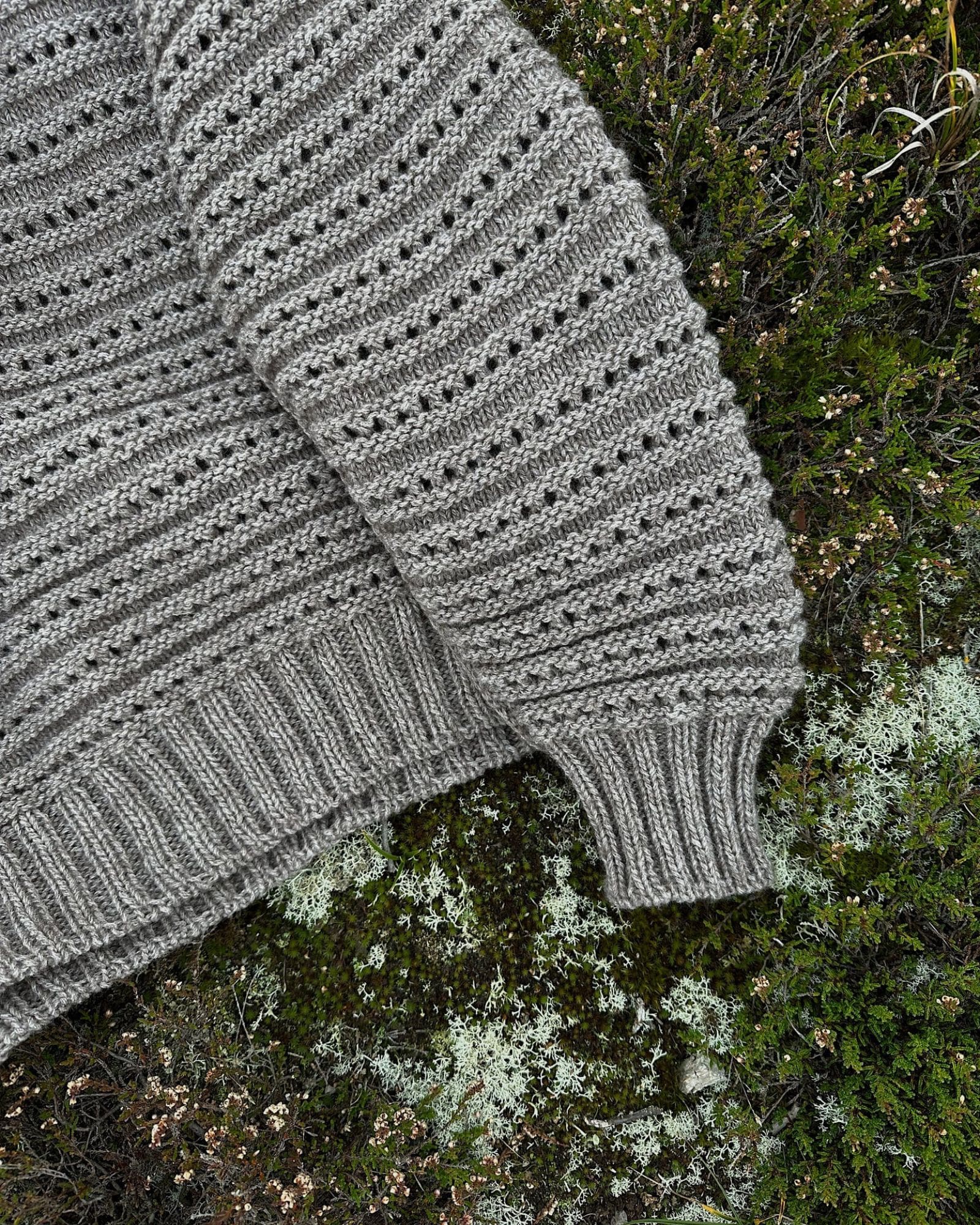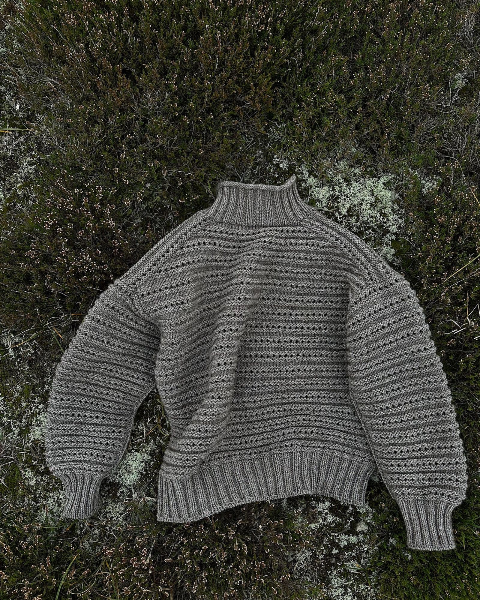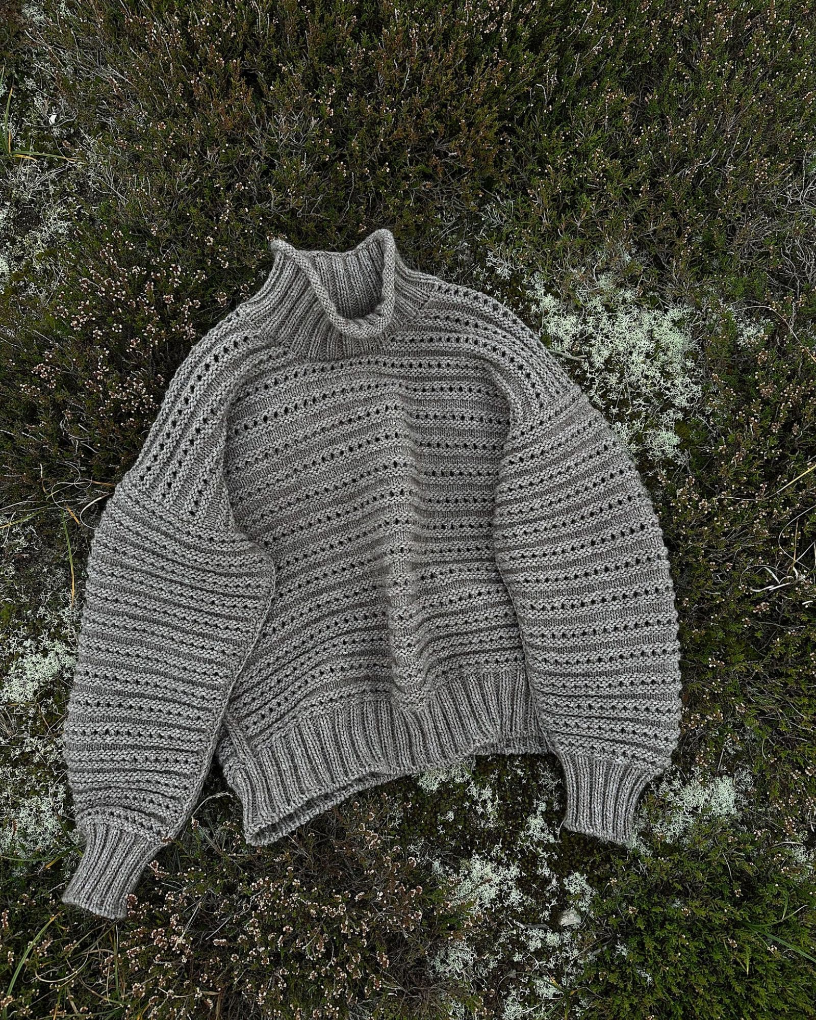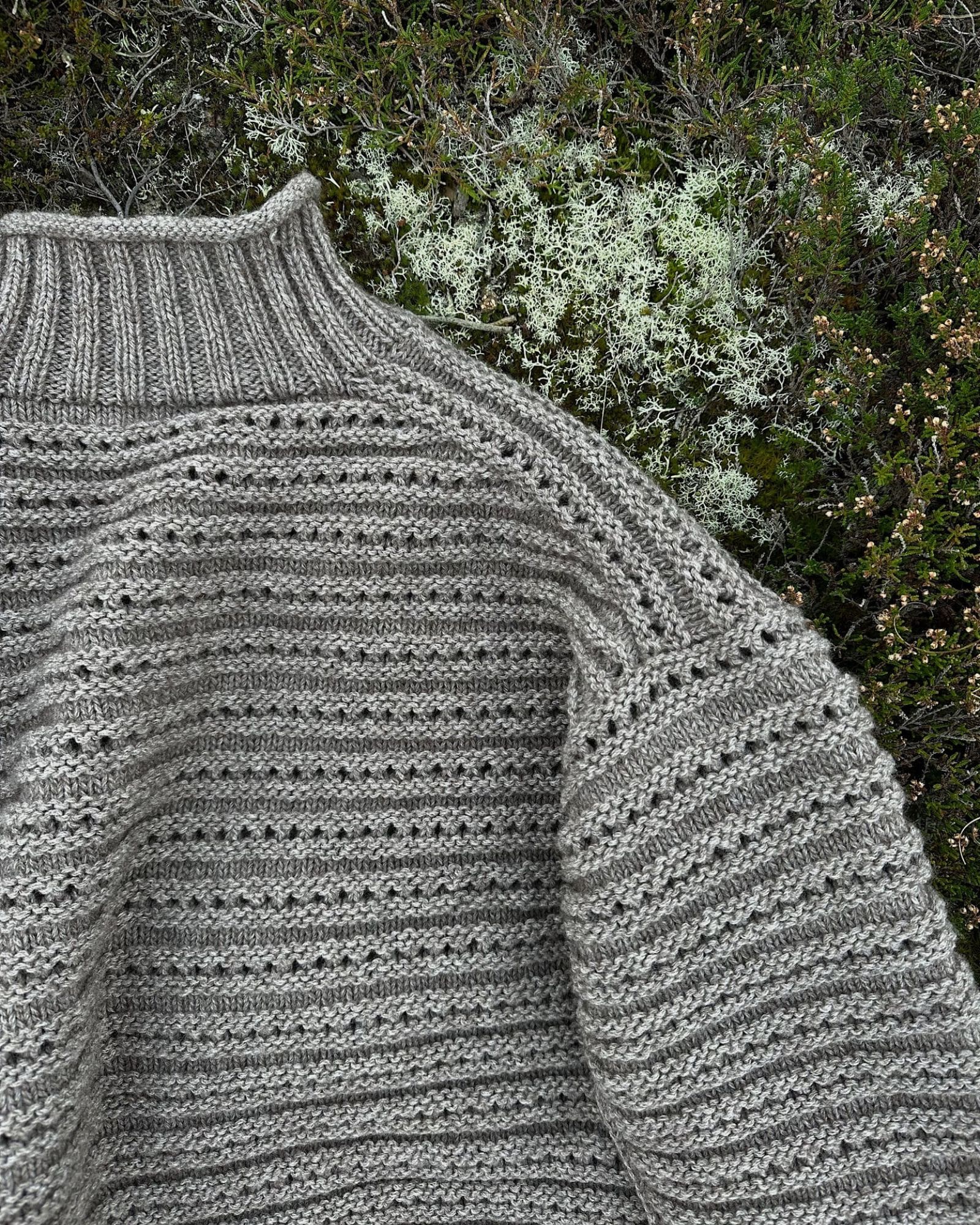 Sweaterens silhuet er let asymmetrisk med en smule ekstra længde på bagstykket. Arbejdet strikkes oppefra og ned og er monteringsfrit.