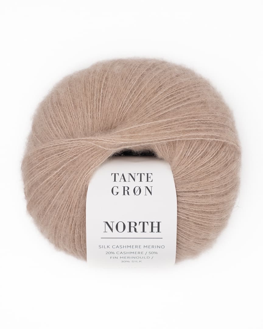 North giver et fjerlet og eksklusivt resultat. Det består af 50% Fin Merinould, 30% Silke & 20% Cashmere. Nøglet vejer 25 gram og har en løbelængde på 275 meter.