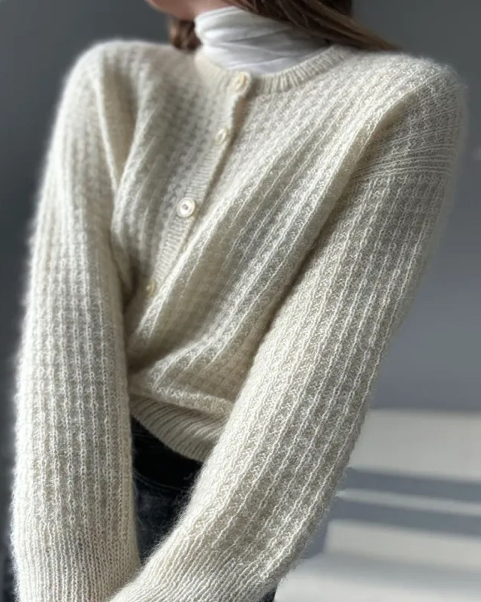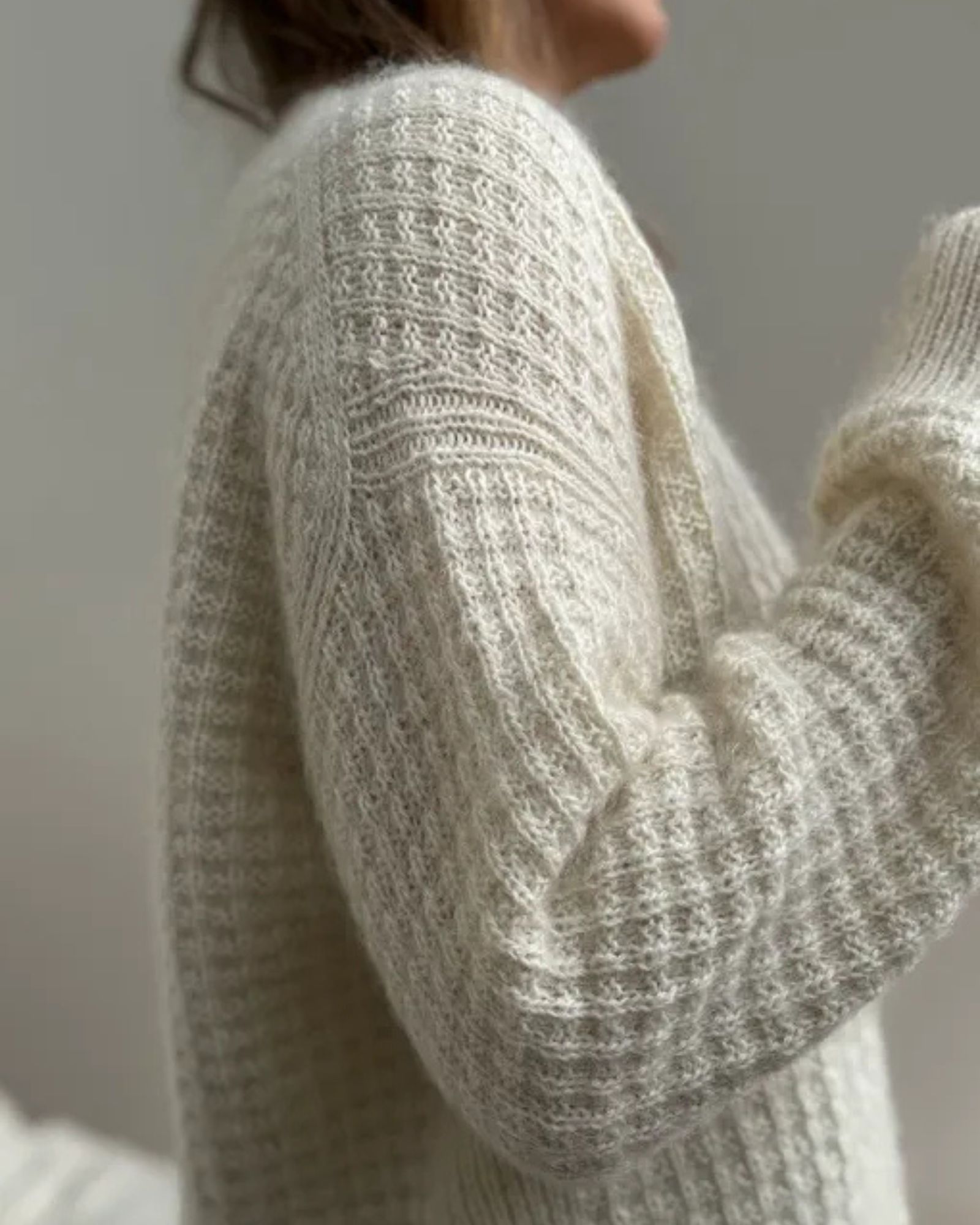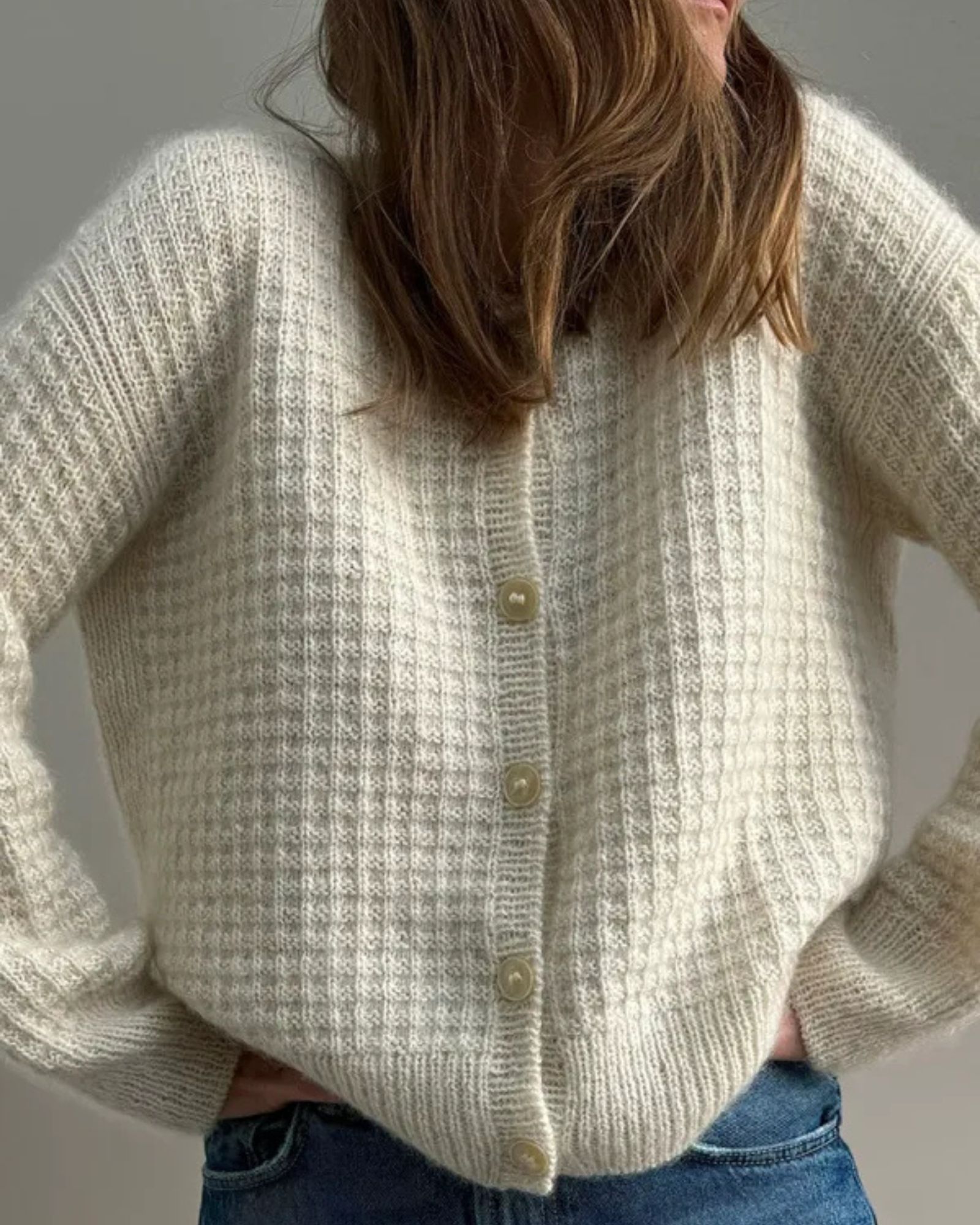 Den hvide Waffle Loop Cardigan er strikket i Isager Tweed fv. White sammen med Isager Silk Mohair fv. E0.