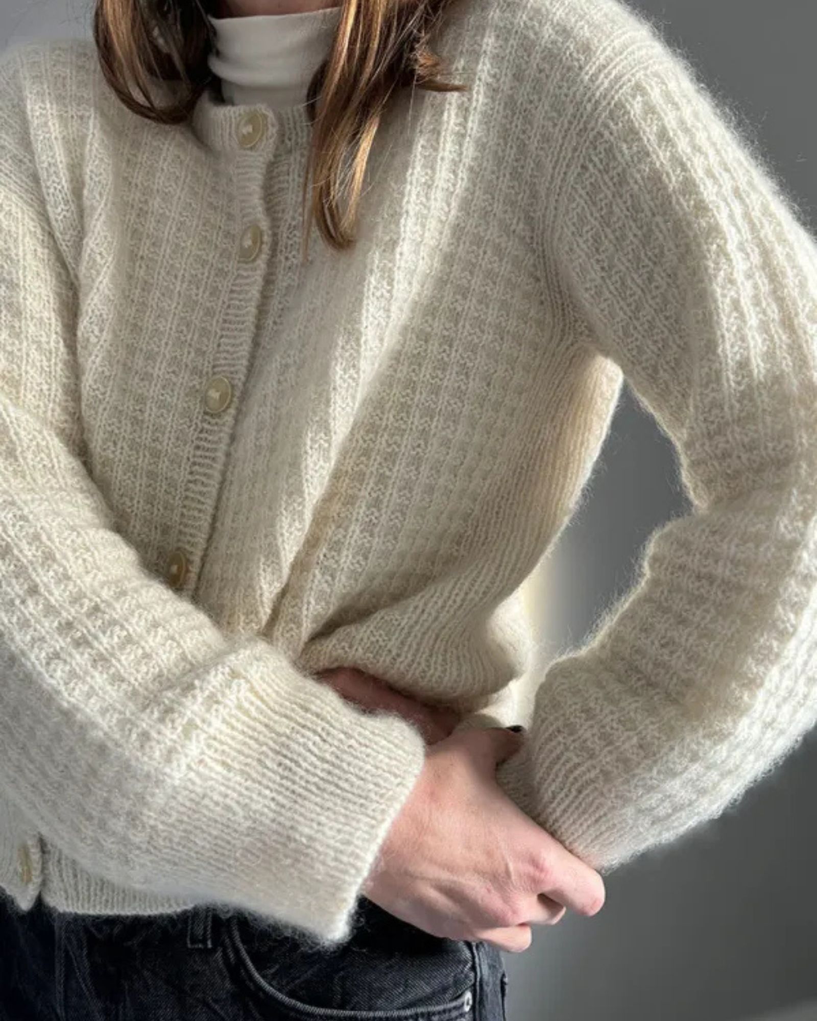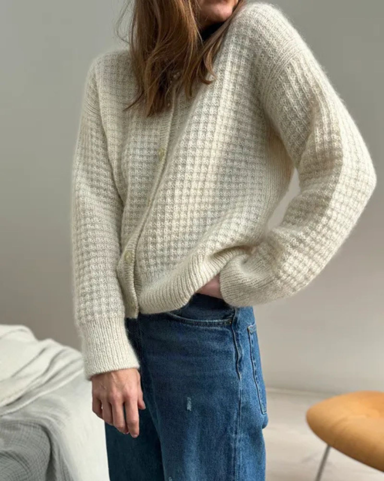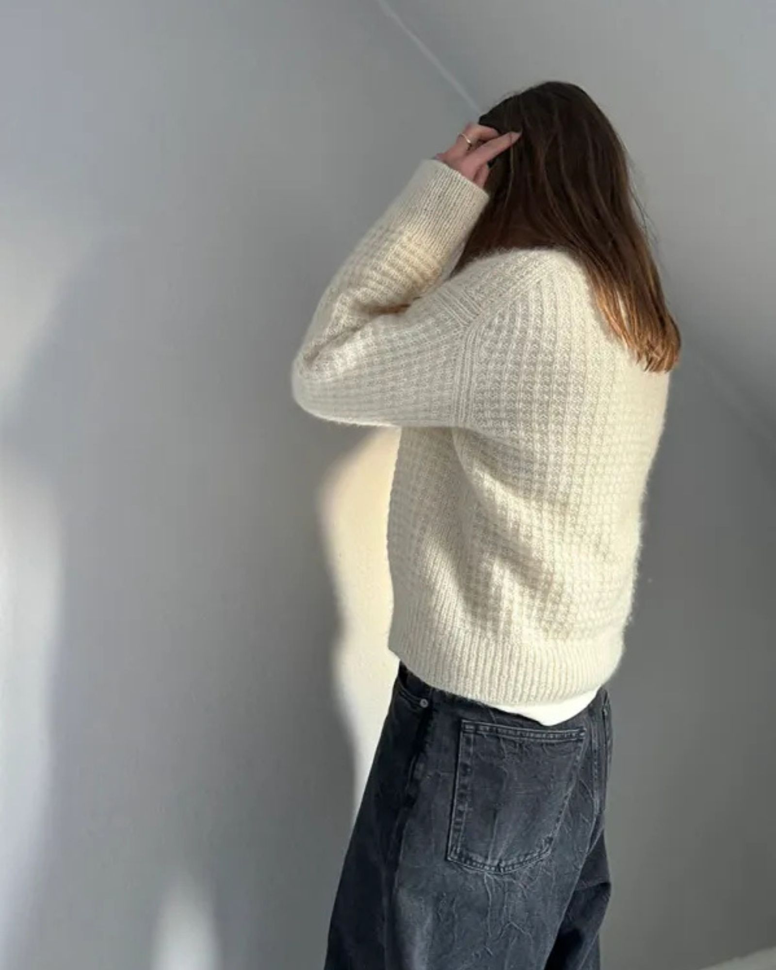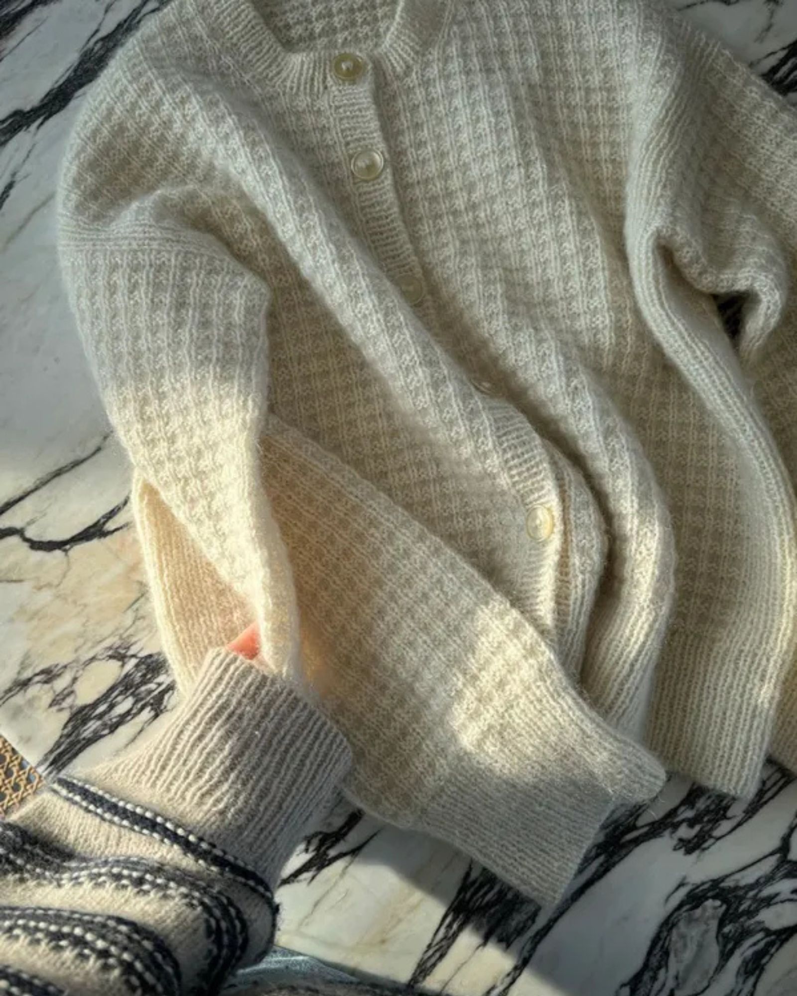 Den hvide Waffle Loop Cardigan er strikket i Isager Tweed fv. White sammen med Isager Silk Mohair fv. E0.