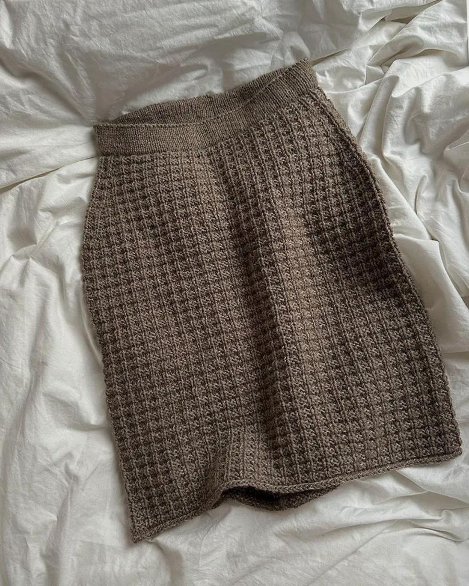 Nederdelen strikkes oppefra og ned. Først strikkes talje-kanten rundt i glatstrik, kanten foldes ned og strikkes fast. Herefter starter vaffelstrukturen og der strikkes vendepinde for at skabe højde på nederdelens bagstykke. Derefter strikkes rundt i vaffelstruktur og der strikkes udtagninger til hoften i begge sider af arbejdet.