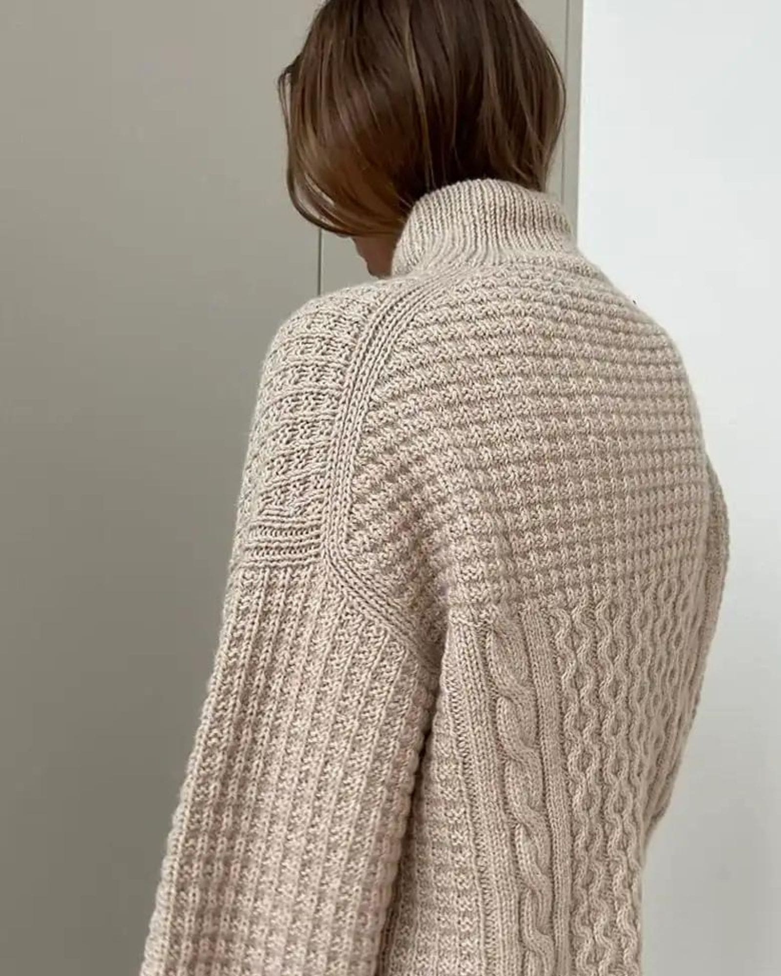 Sweateren strikkes oppefra og ned. Først slåes masker op til nakken, herefter strikkes frem og tilbage i vaffelstruktur og med ribmasker i begge sider af arbejdet, samtidig med at der strikkes udtagninger for at skabe formen på den øverste del af bagstykket. Herefter samles masker op langs skulderkanten, skuldrene strikkes frem og tilbage hver for sig. De 2 skuldre samles til forstykke ved at slå masker op fortil. For- og bagstykket samles og kroppen strikkes rundt i vaffelstruktur, snoninger efter diagram og med rib i siderne. Ærmemaskerne samles op i ærmeåbningen og ærmerne strikkes rundt i vaffelstruktur. Ærmerne formes med et indtagningsforløb og afsluttes med en ribkant. Til sidst samles halskantens masker op og strikkes rundt i rib, ribkanten afsluttes med italiensk aflukning.