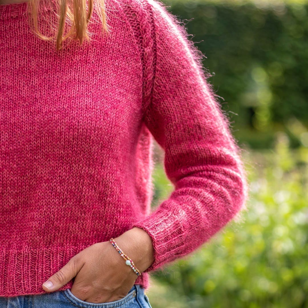 Sweateren på billedet er strikket i Silk Mohair farve 36 Hindbær (udgået) og Bio Blomsterfrø farve 05 Rabarber (Udgået).