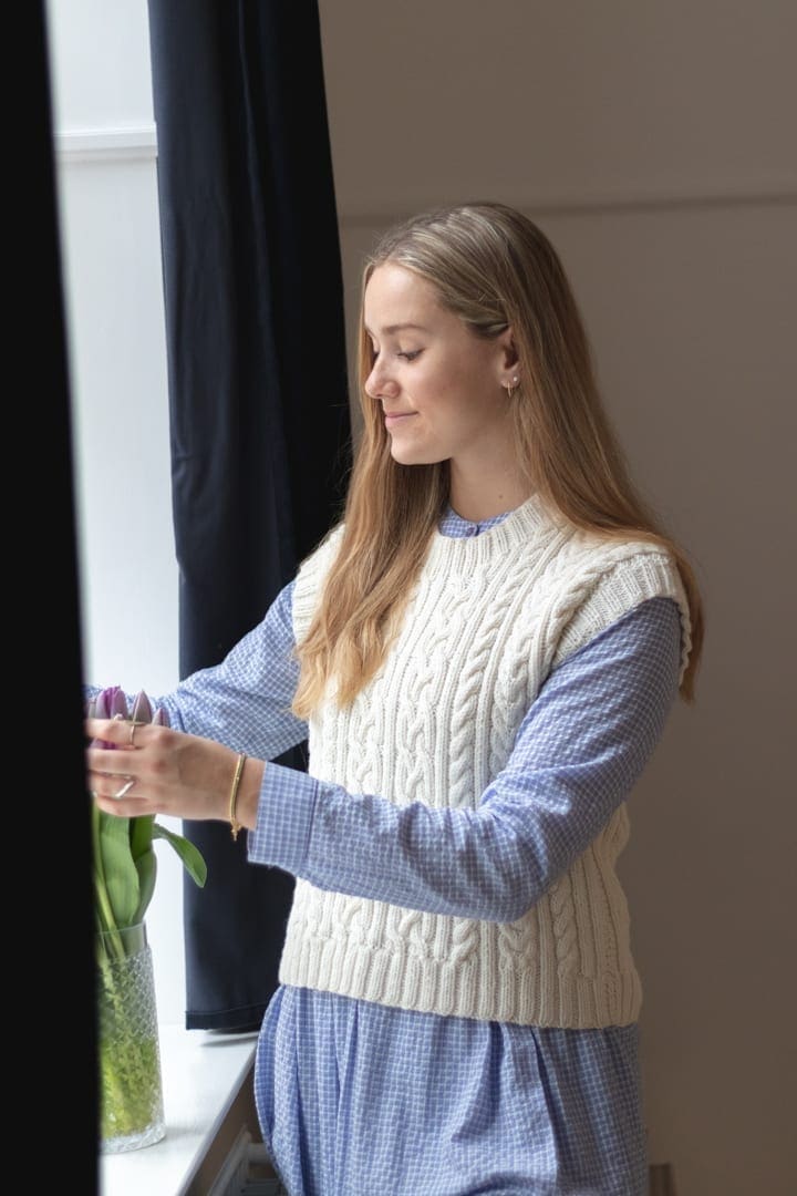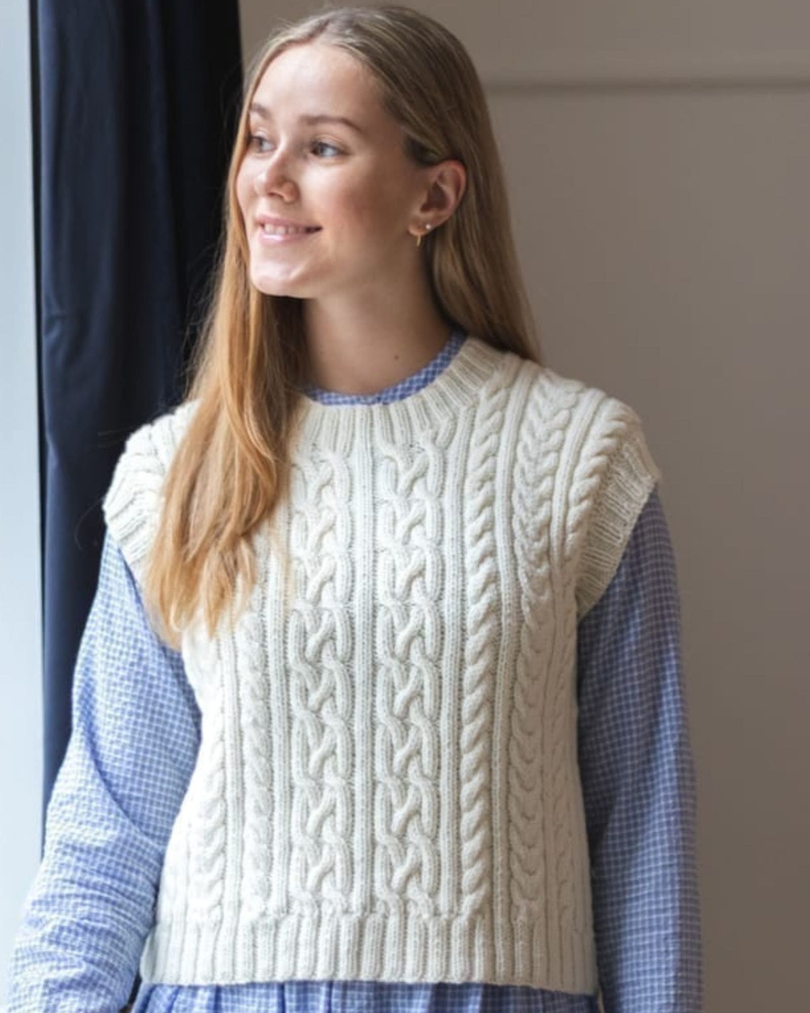 Pearl Slipover er strikket i vores bløde merinould Hazel eller Double Sunday, så den er helt kradsefri. Hazel og Double Sunday er begge bløde som smør og nemme at strikke i. Vesten strikkes på pinde 4,5 mm.