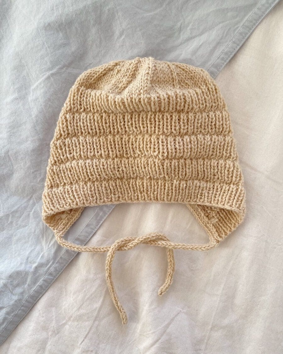 Det ribstrikkede stykke er elastisk og vil udvide sig og forme sig efter barnets hoved.