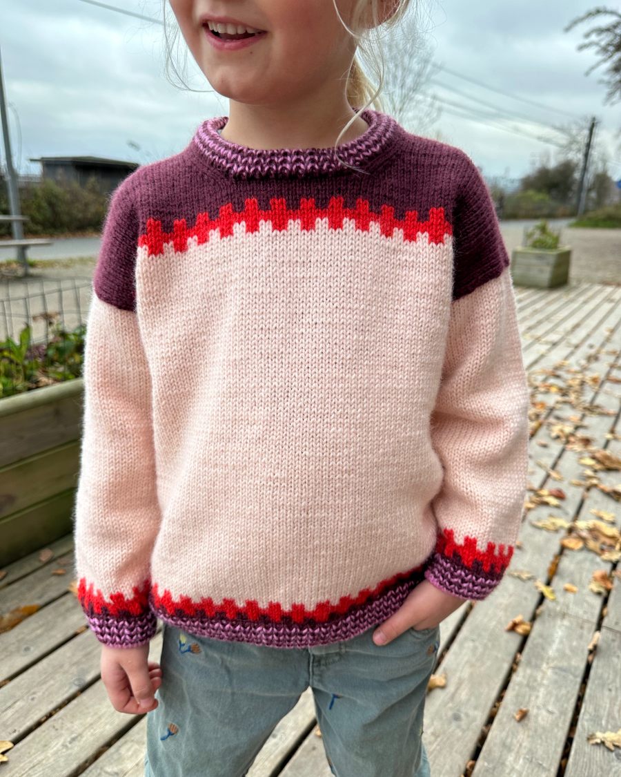 Den lyserøde og blå Cross Sweater Junior er strikket i Peer Gynt fra Sandnes Garn i farverne 3509 Ballet tutu, 4363 Vinrød, 4008 Poppy og 4626 Shocking pink.