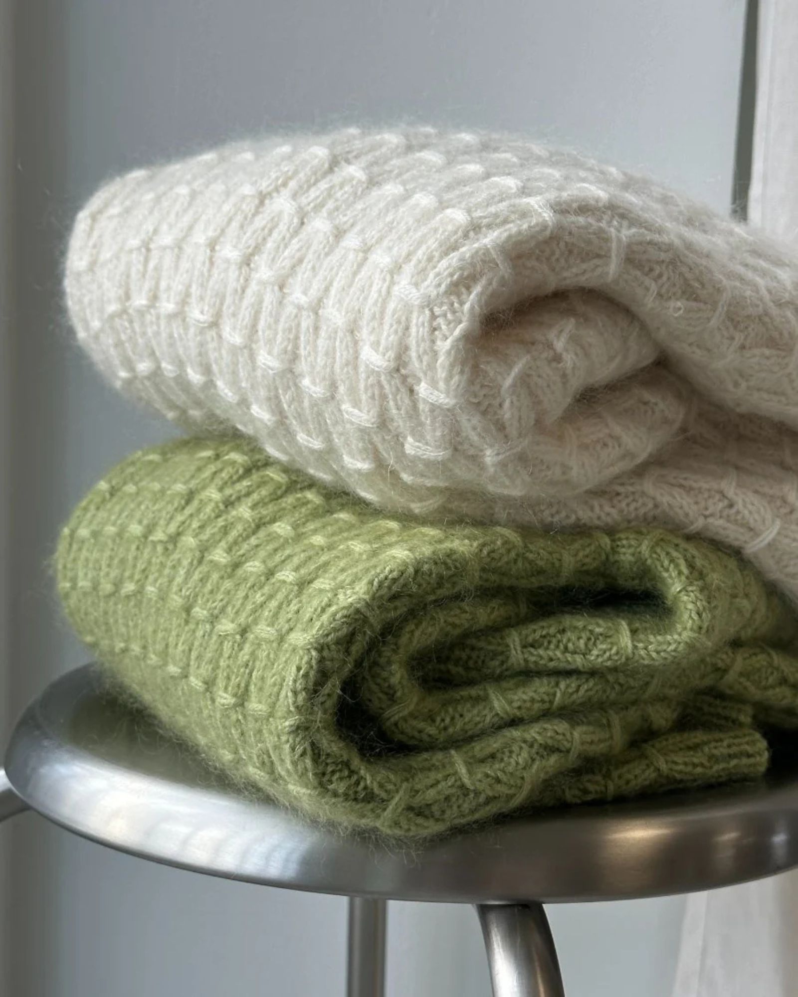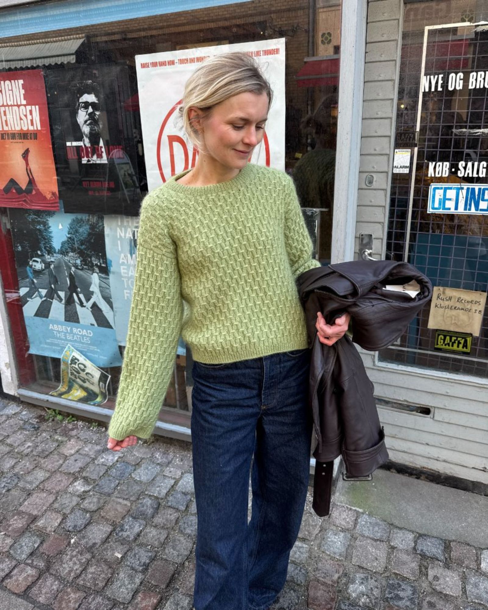 Den grønne Jenny Blouse er strikket i Sunday fra Sandnes Garn i farven 9533 Green tea sammen med Silk Mohair fra Isager i farve 57.