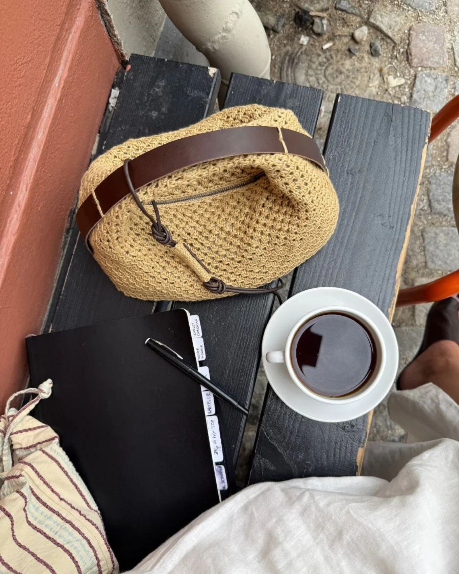 Den mørkebrune Juno Bag er strikket i Hør Organic fra Isager i farven Camel.