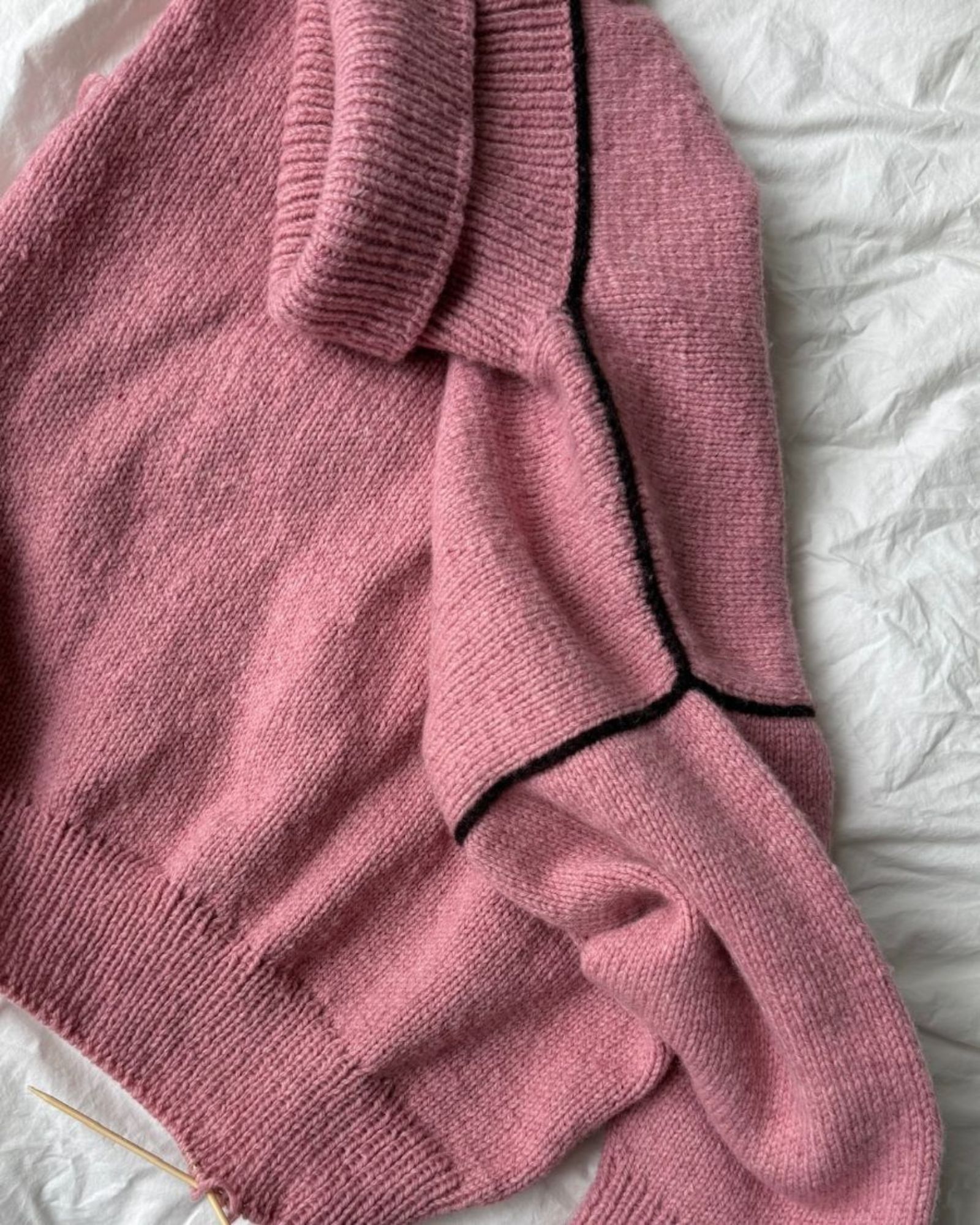 Linea Sweater fra PetiteKnit strikkes oppefra og ned. Ryggen strikkes først frem og tilbage på pinden med vendepinde for at skabe rygstykkets buede form. Langs ryggens opslagskant strikkes en linje i kontrastfarve, der understreger ryggens formgivning. Skuldrene og forstykke strikkes ud fra opsamlede masker i denne linje. Ærmerne strikkes ud fra opsamlede masker i ærmeåbningen. Til sidst samles masker op langs halsåbningen, og der strikkes en halskant i rib.