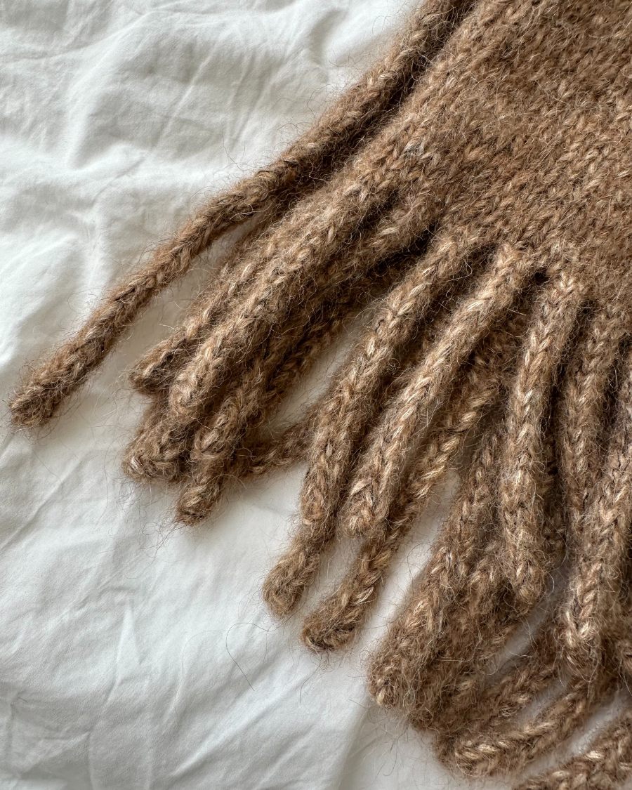 Den brune Nora Neck er strikket i Isager Soft fra Isager i farve E7S sammen med Silk Mohair fra Isager i farve 7S, men den kan også strikkes i Moon fra Tante Grøn i fv. 103 Nougat sammen med Soft Silk Mohair i farve 104 Fudge.