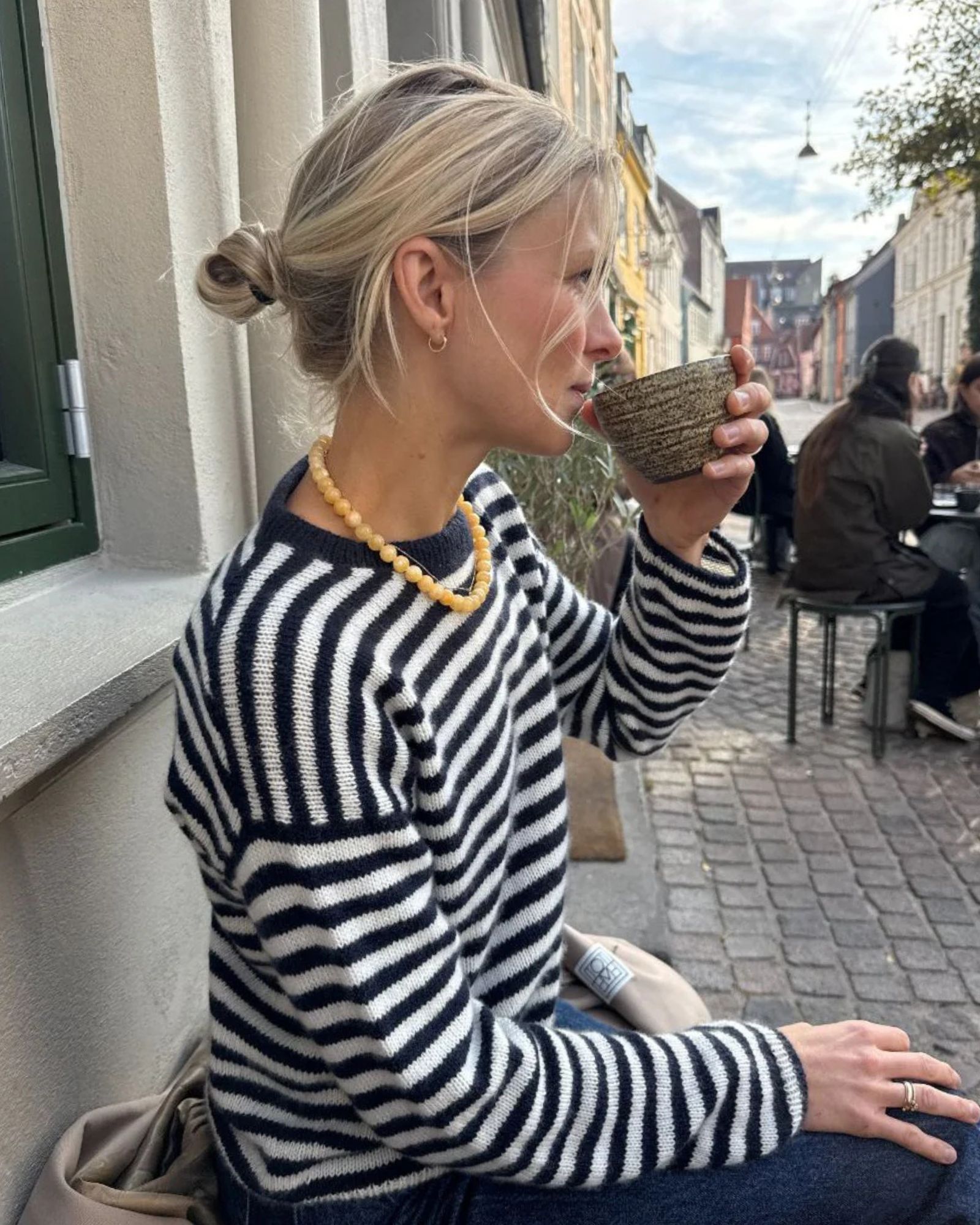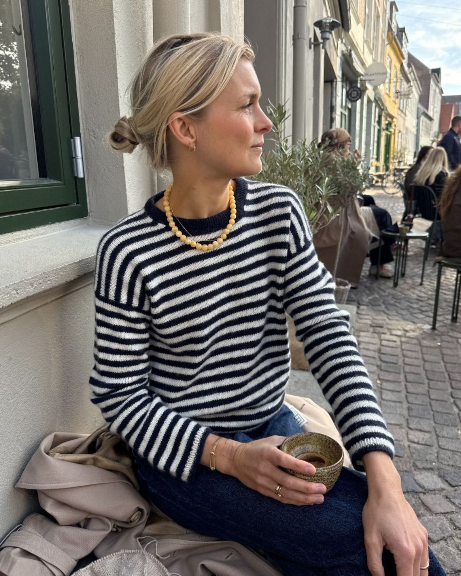 Den blå og hvide Olga Blouse er strikket i Cashmere Classic fra Cardiff i farverne 647 Cosmo og 599 Panna.