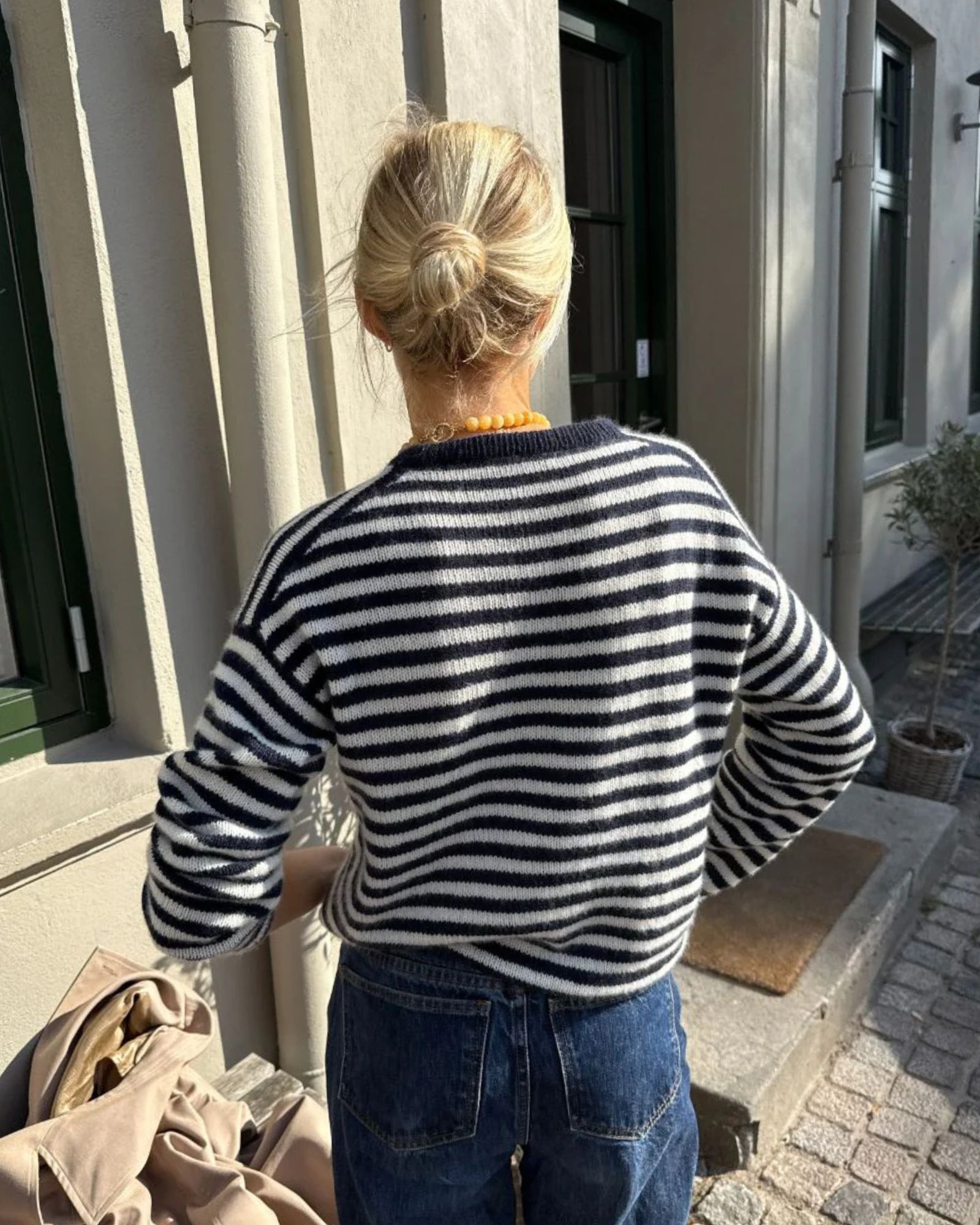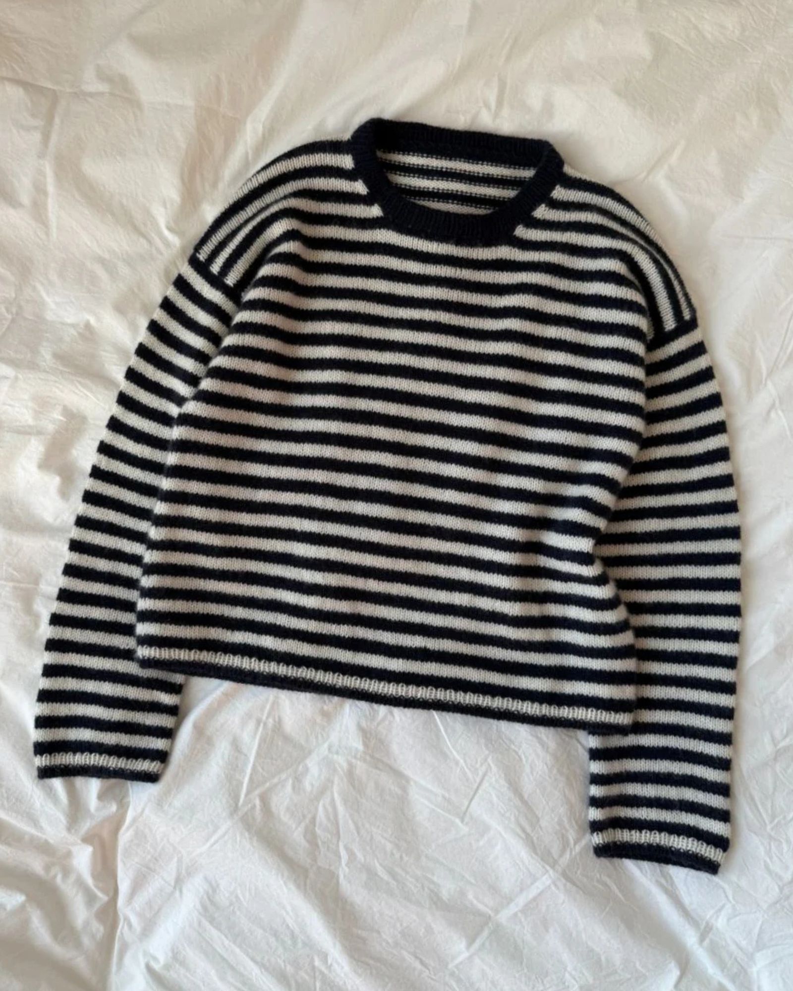 Olga Blouse af PetiteKnit strikkes oppefra og ned i striber. Først strikkes øverste del af ryggen frem og tilbage, idet hældning af skuldrene formes med vendepinde, samtidig med, at der strikkes striber. Herefter strikkes skuldrene hver for sig frem og tilbage på rundpind. Disse samles fortil for at danne forstykke. Forstykke og ryg samles herefter for at danne kroppen, der strikkes rundt på rundpind med striber. Ærmerne strikkes ud fra opsamlede masker langs ærmeåbningen. Halsens ombukkede halskant strikkes til sidst ud fra opsamlede masker.