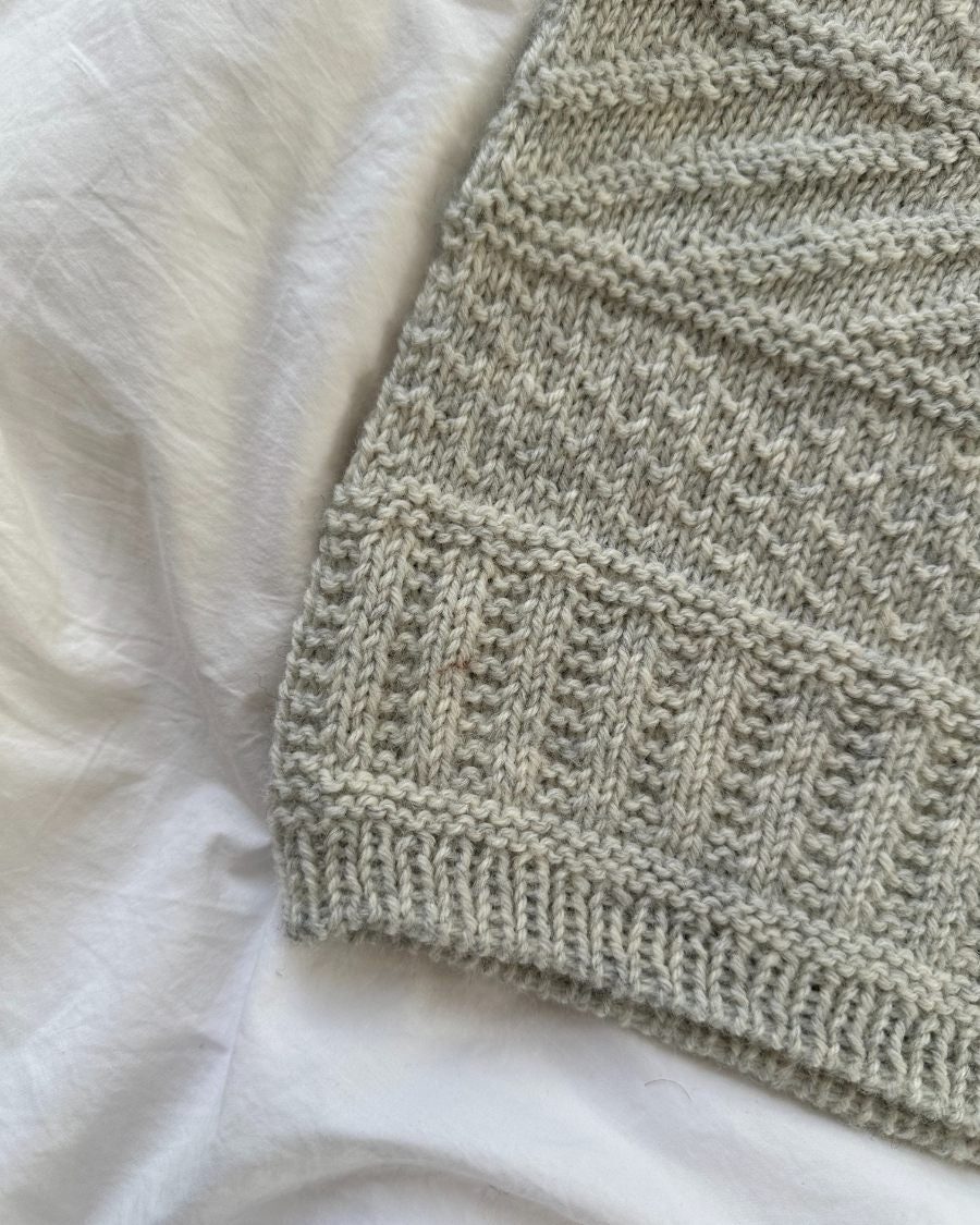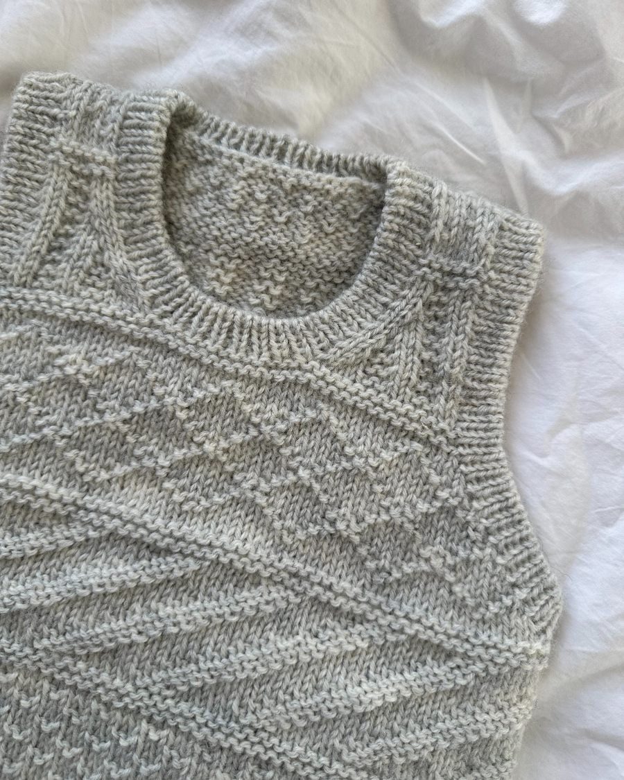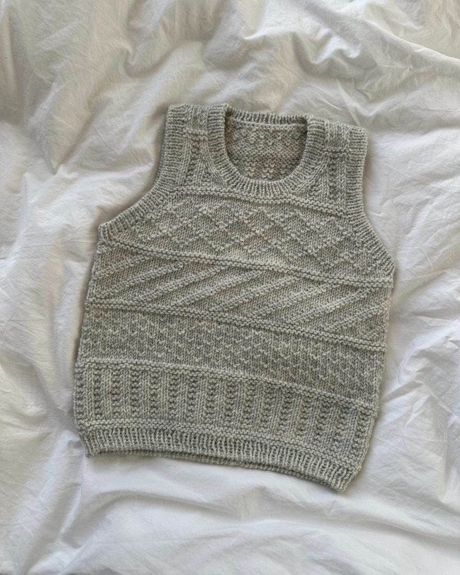 Den grå Storm Slipover Junior er strikket i Peer Gynt fra Sandnes Garn i farven 1021 Ash melange.