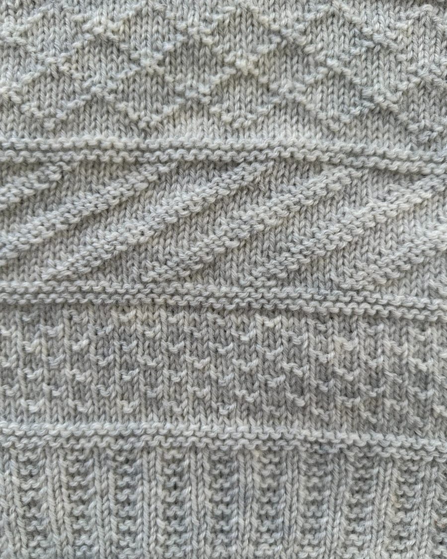 Strikkefasthed: 20 masker x 32 pinde i strukturstrik på pind 4 mm = 10 x 10 cm