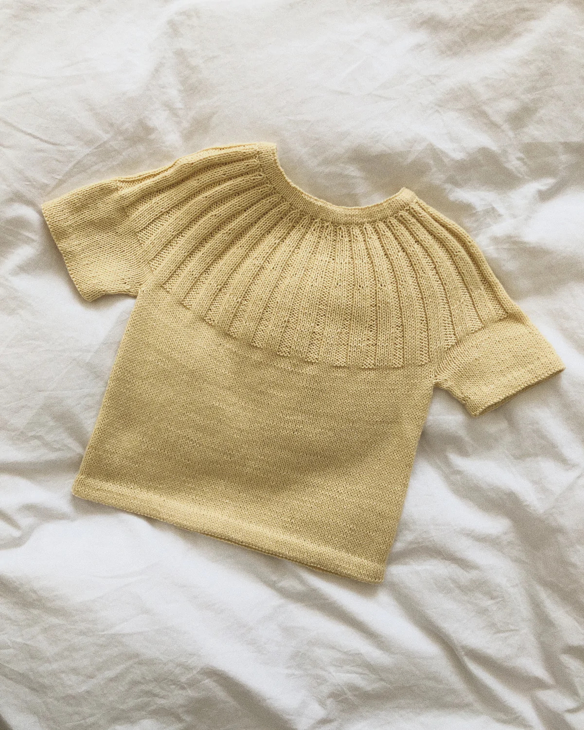 Sunday Tee Junior strikkes oppefra og ned. Bærestykket strikkes rundt i rib med udtagninger. Krop og ærmer strikkes rundt i glatstrik og afsluttes begge af en ombukket kant.
